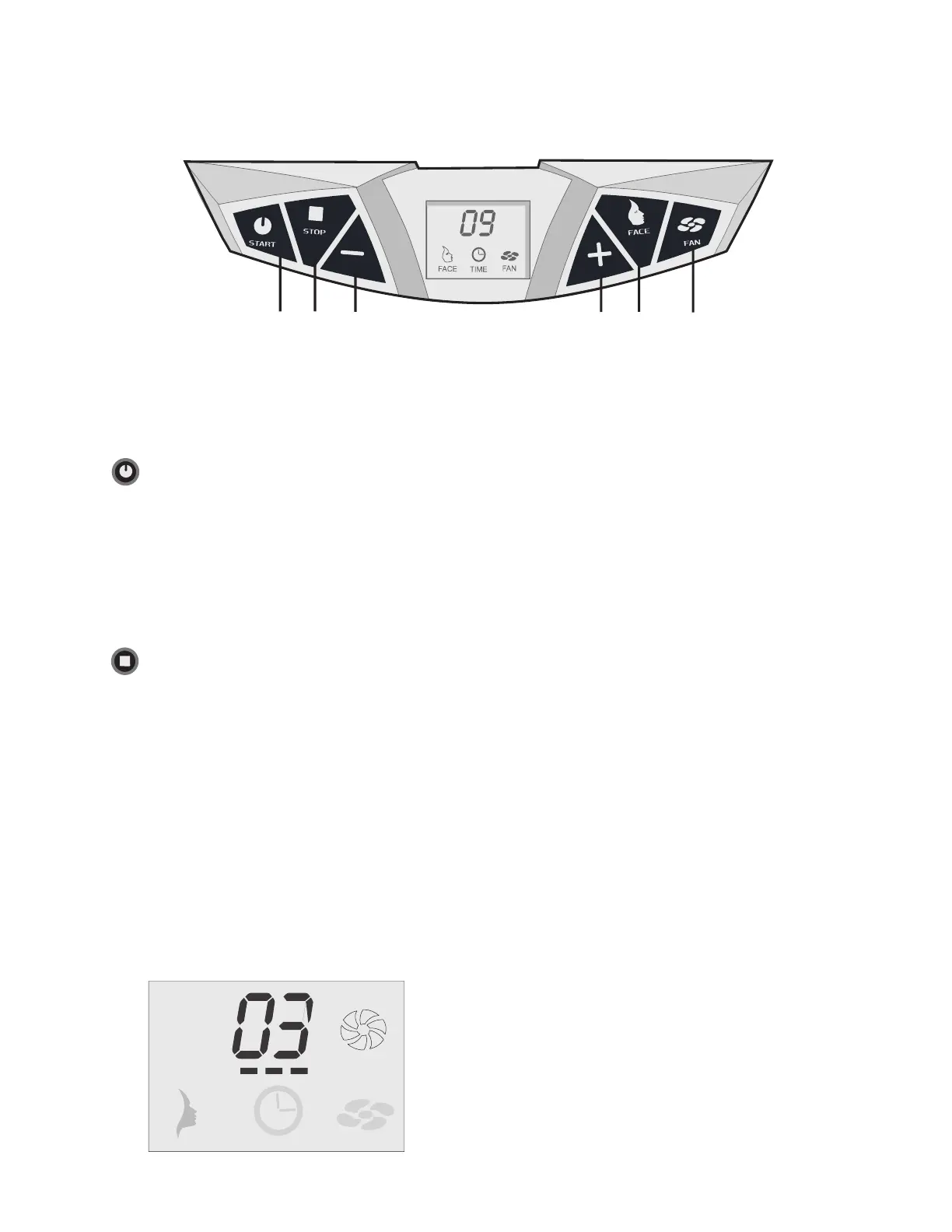 By depressing start once the “+ and –“ buttons can be used to set the tanning time.