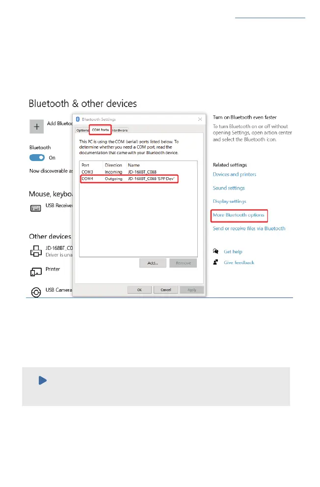 a.Click ' Bluetooth & other device' > ' More Bluetooth options' > 'COM Ports' > Check
