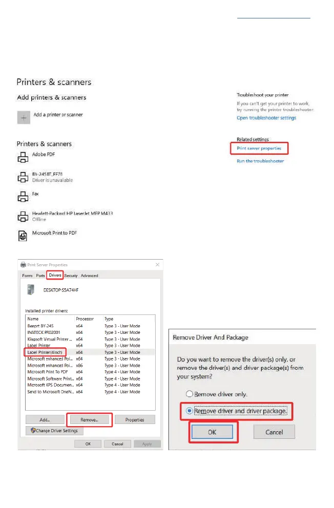 2. Click'Print server properties'>>Findthe driver'Label printer(4inch)''>>'Remove