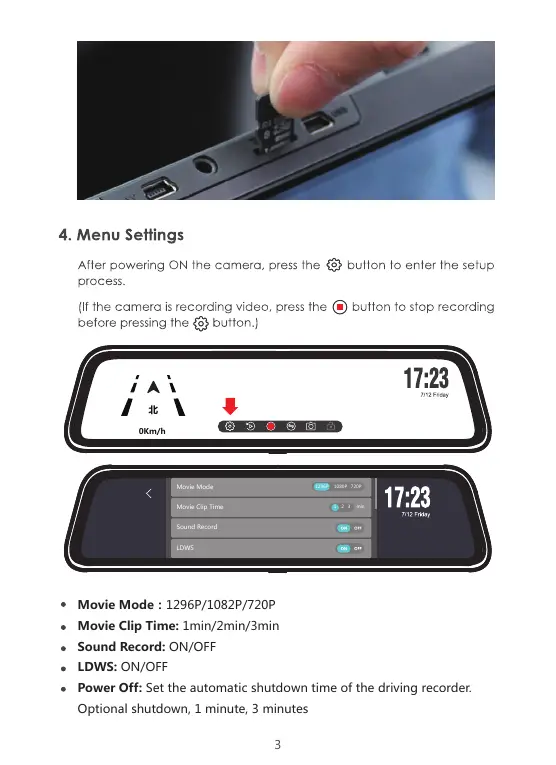 Power Off: Set the automatic shutdown time of the driving recorder.