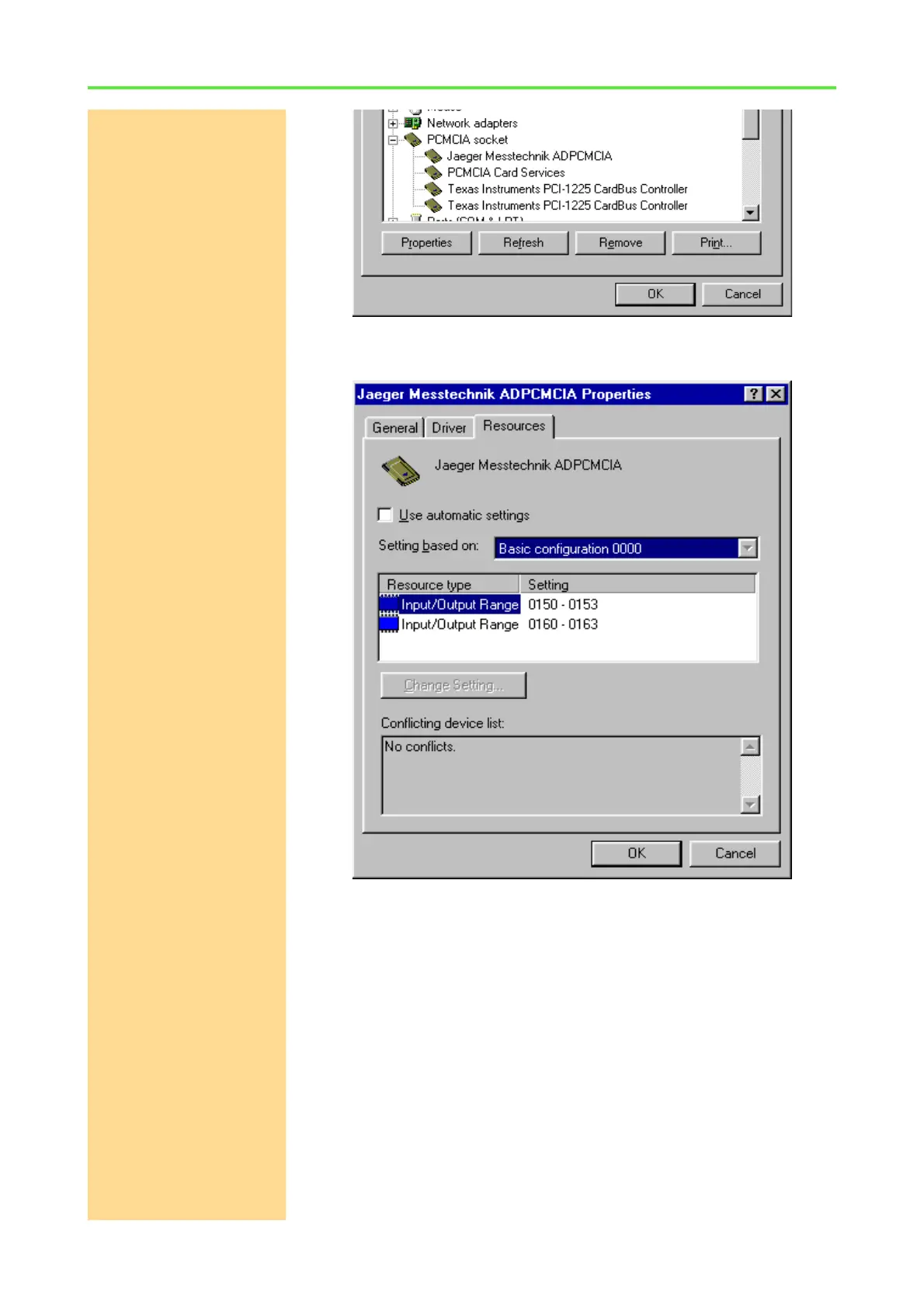 Under the tab: "Resources" you find the settings of the ADpcmcia card. The
