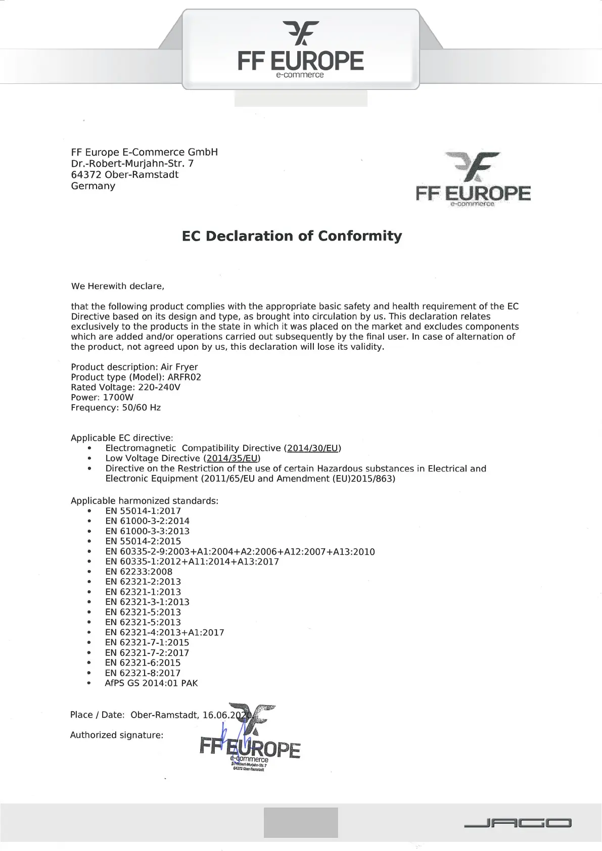JAGO ARFR02 - EC Declaration of Conformity