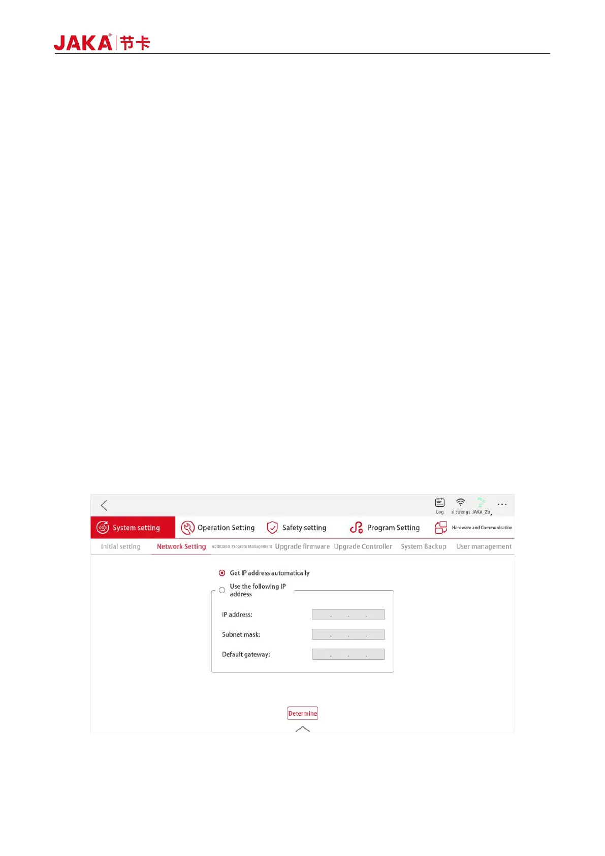 IP address dynamically. Users can login JAKA Zu APP and configure it with static IP with the path as follows: