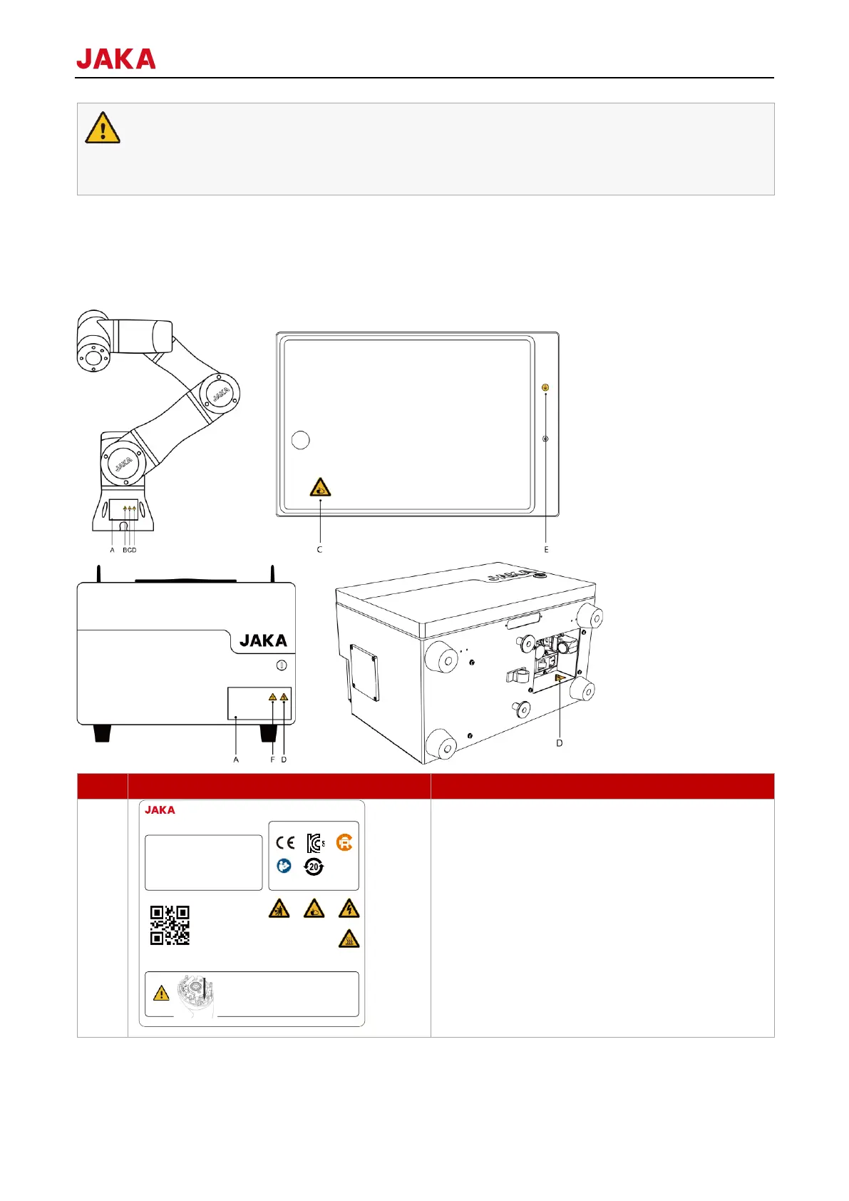 The following labels are safety warning labels and product label on the robot and the control cabinet. During the