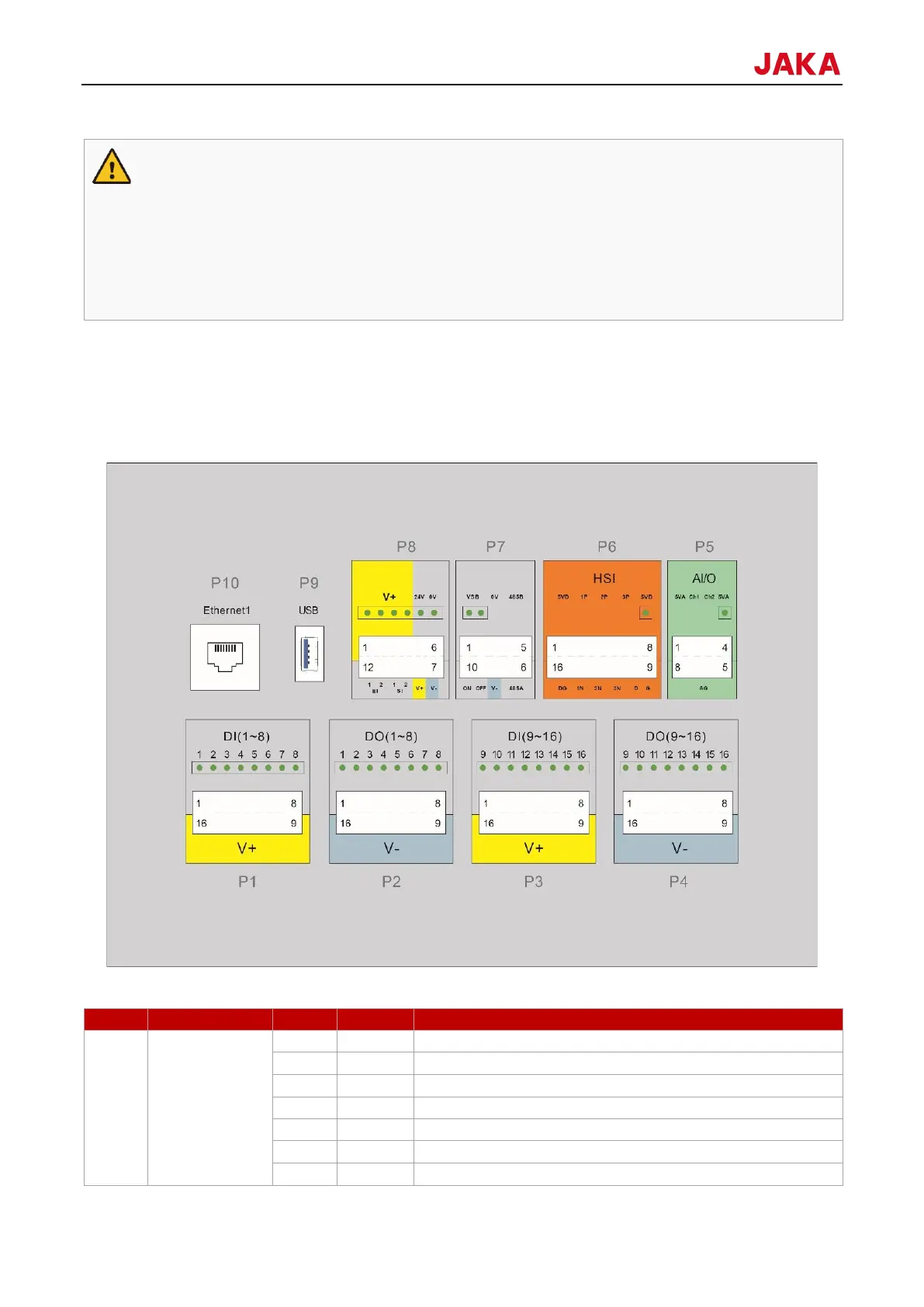 a set of high-speed interfaces (P6), remote switching and RS485 interfaces (P7), safety function interfaces (P8),