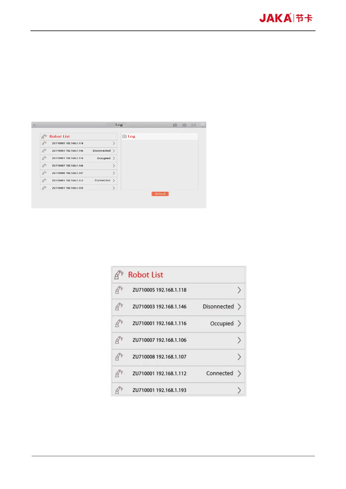 JAKA Zu 7 - Log Information Page; Robot List Area
