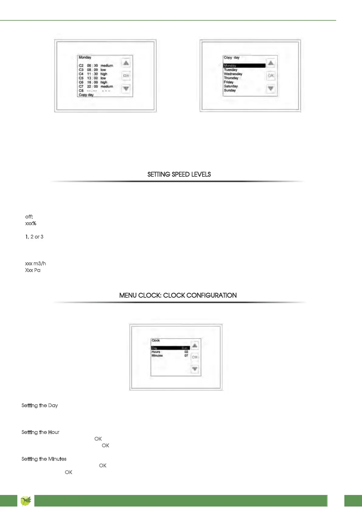 Select the day line and press OK: the color of the writing of the current day configured will turn green. Scroll by means of the arrow keys