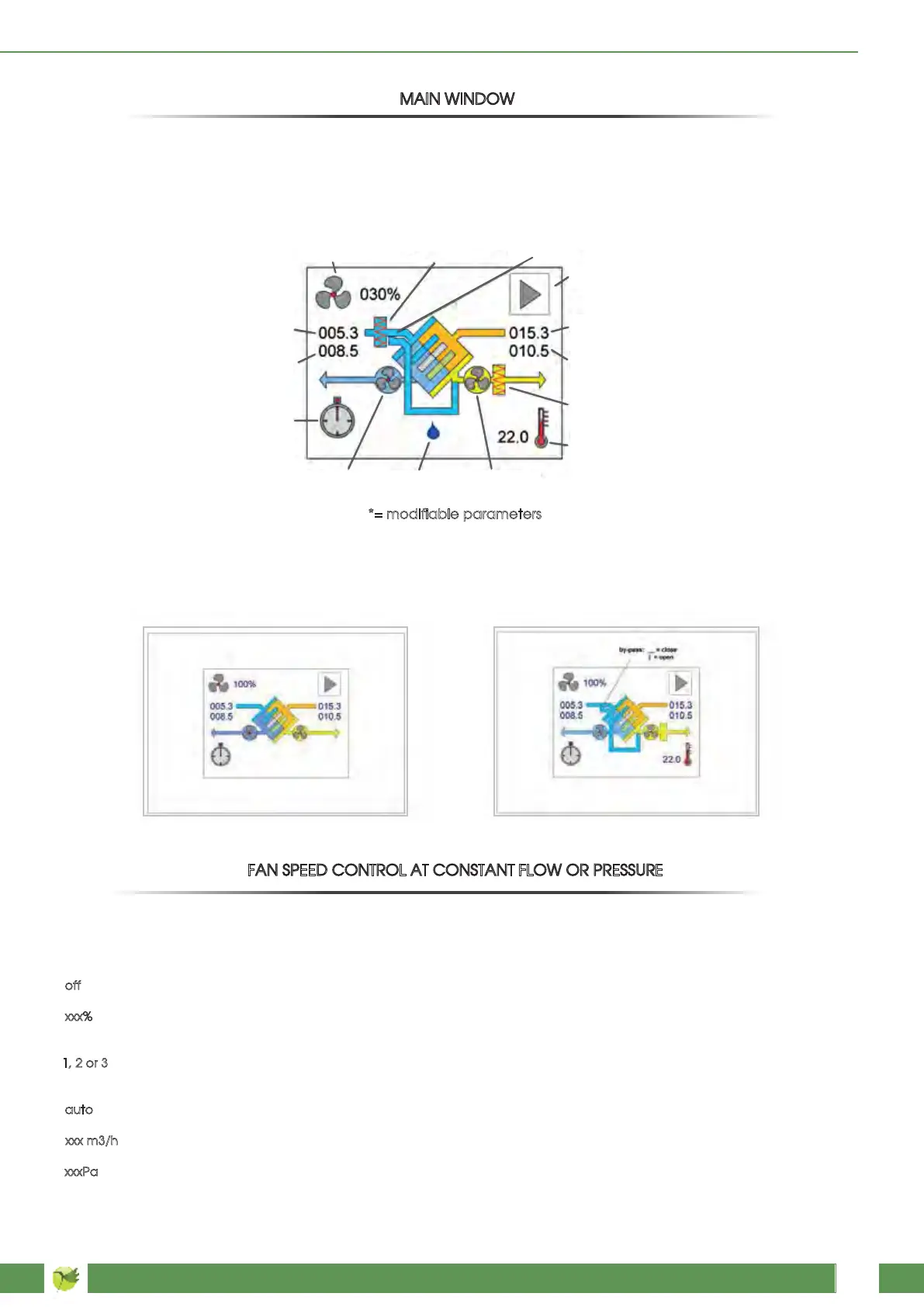 - xxx m3/h: if the unit is in constant flow version (CAV) with kit, the desired value can be set in m3/h of flow. Fans will automatically run