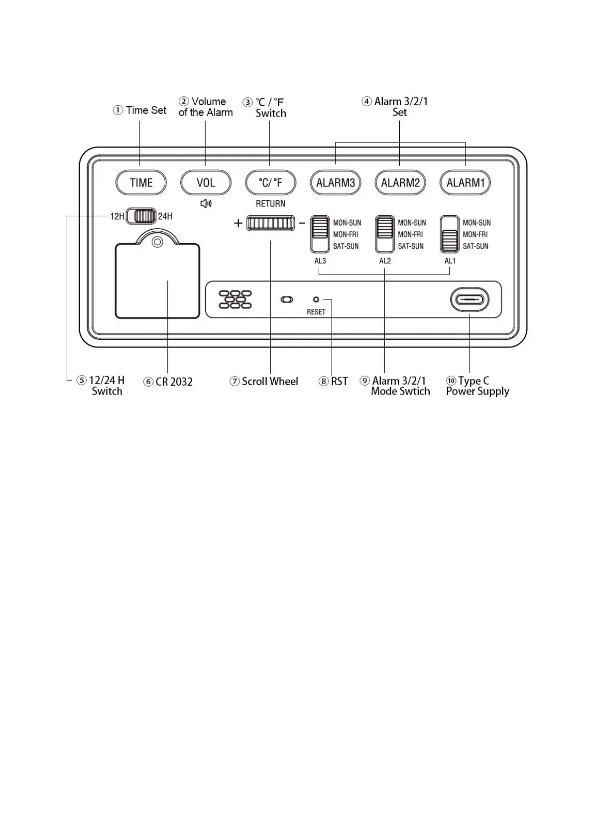 ⑨ Alarm 3/2/1 Mode Switch – “MON-SUN” = Every day; "MON-FRI" = Weekday mode, only activates the alarm on Monday