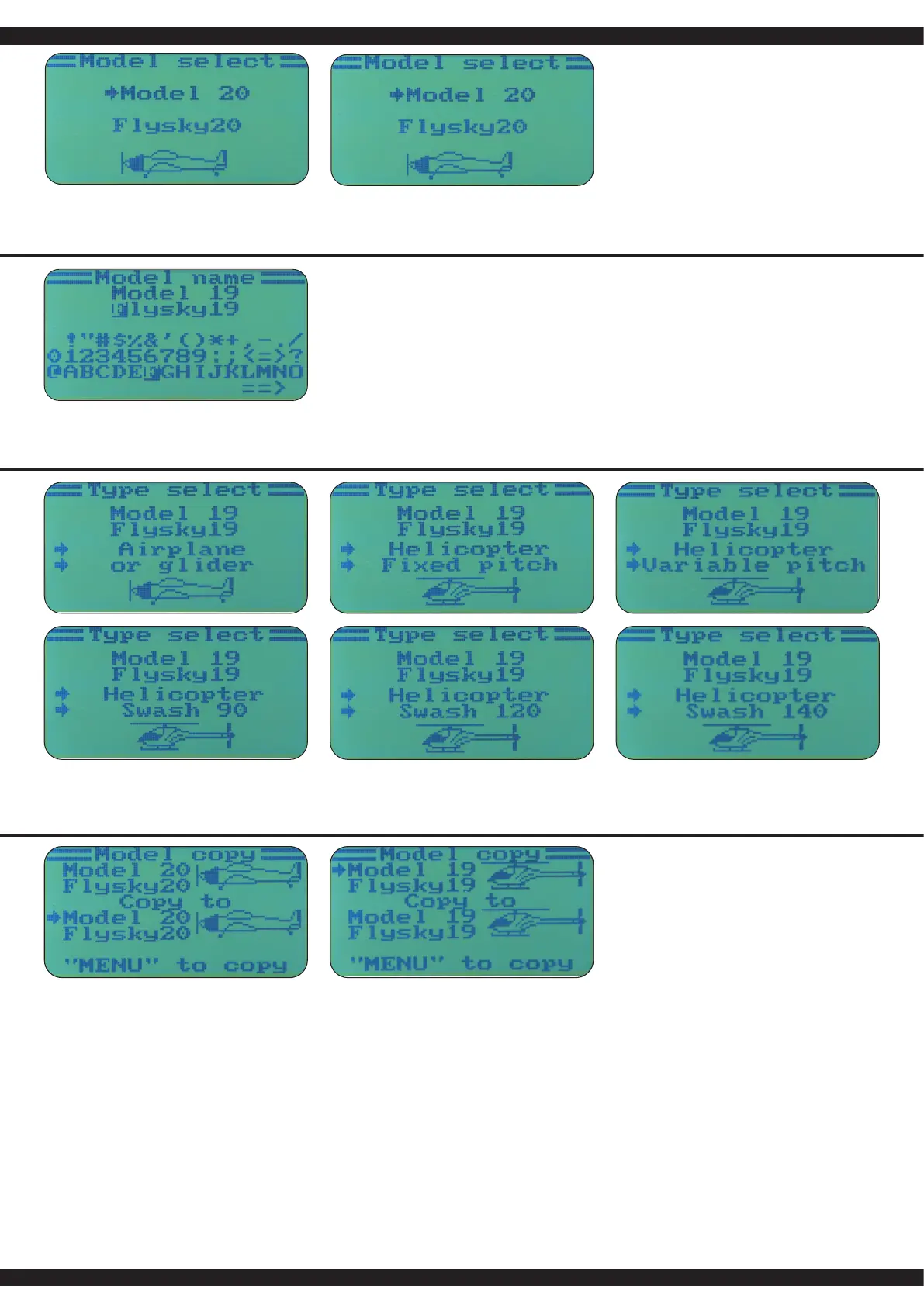 aircraft or helicopter the current model is controlling. The „Functions setup“ menu will be lled accor-