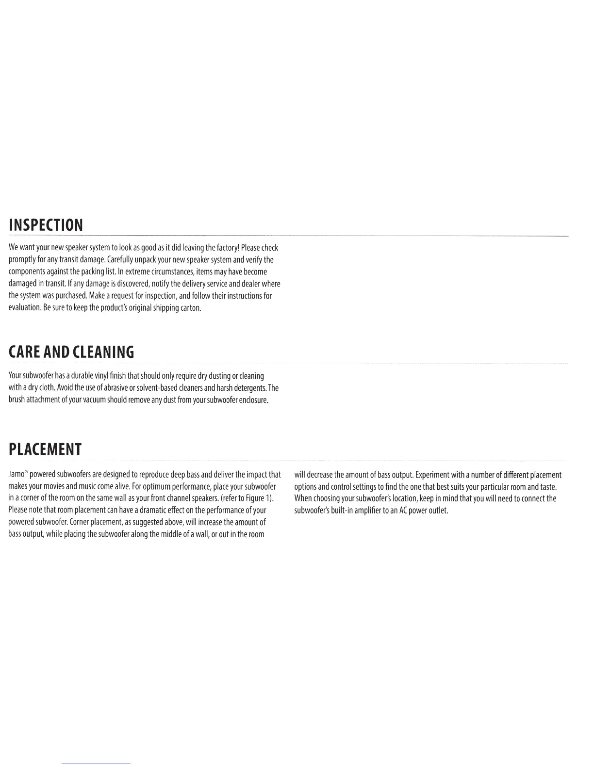 JAMO S 810 SUB - Inspection and Initial Care; Inspection for Transit Damage; Care and Cleaning Instructions; Optimal Subwoofer Placement
