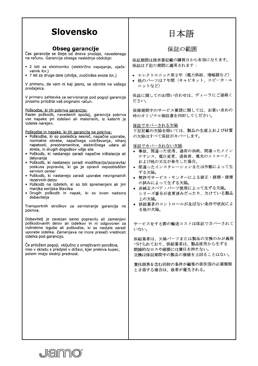 JAMO SUB 200 - Couverture de la Garantie
