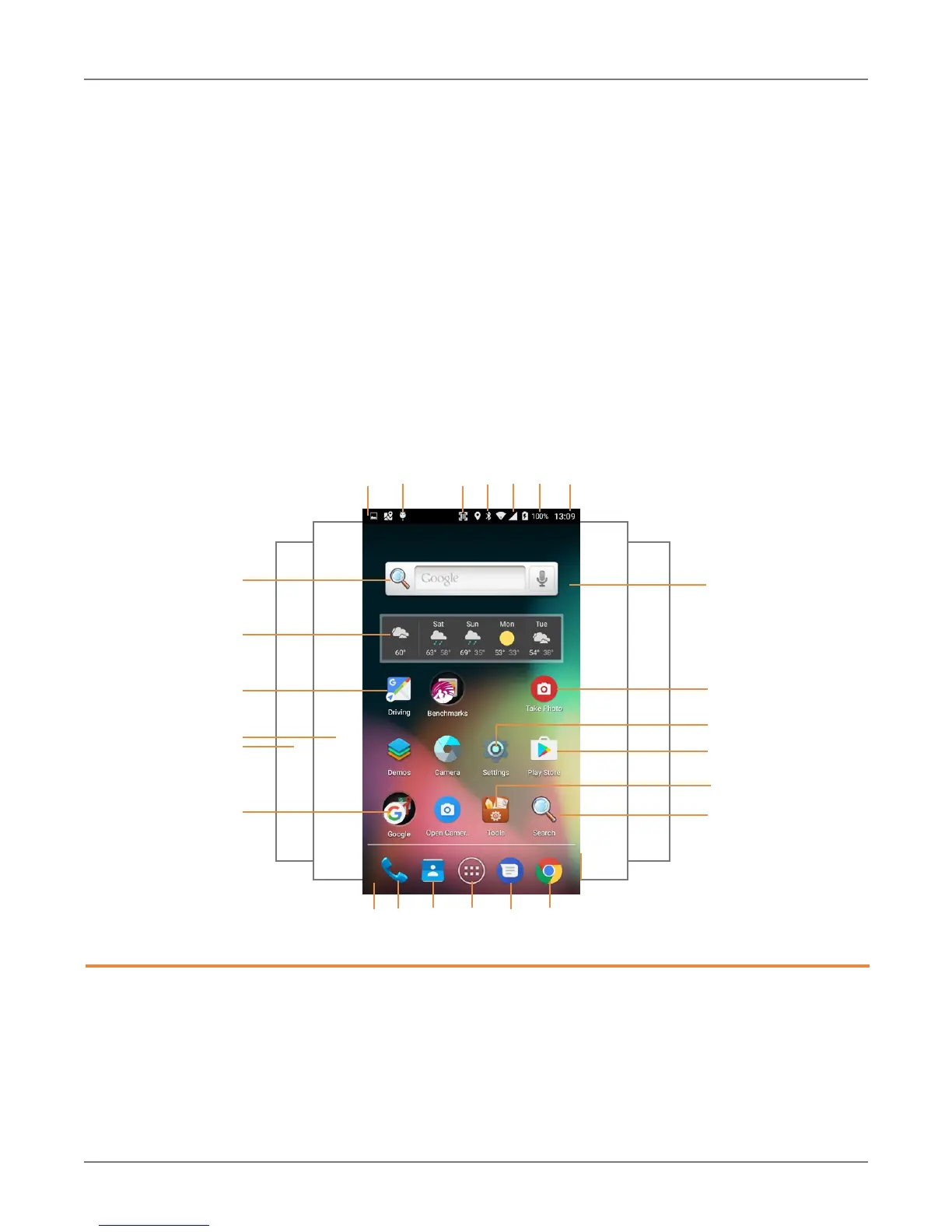 The home screen contains the status bar on top of the screen and the favorites tray at the bottom.