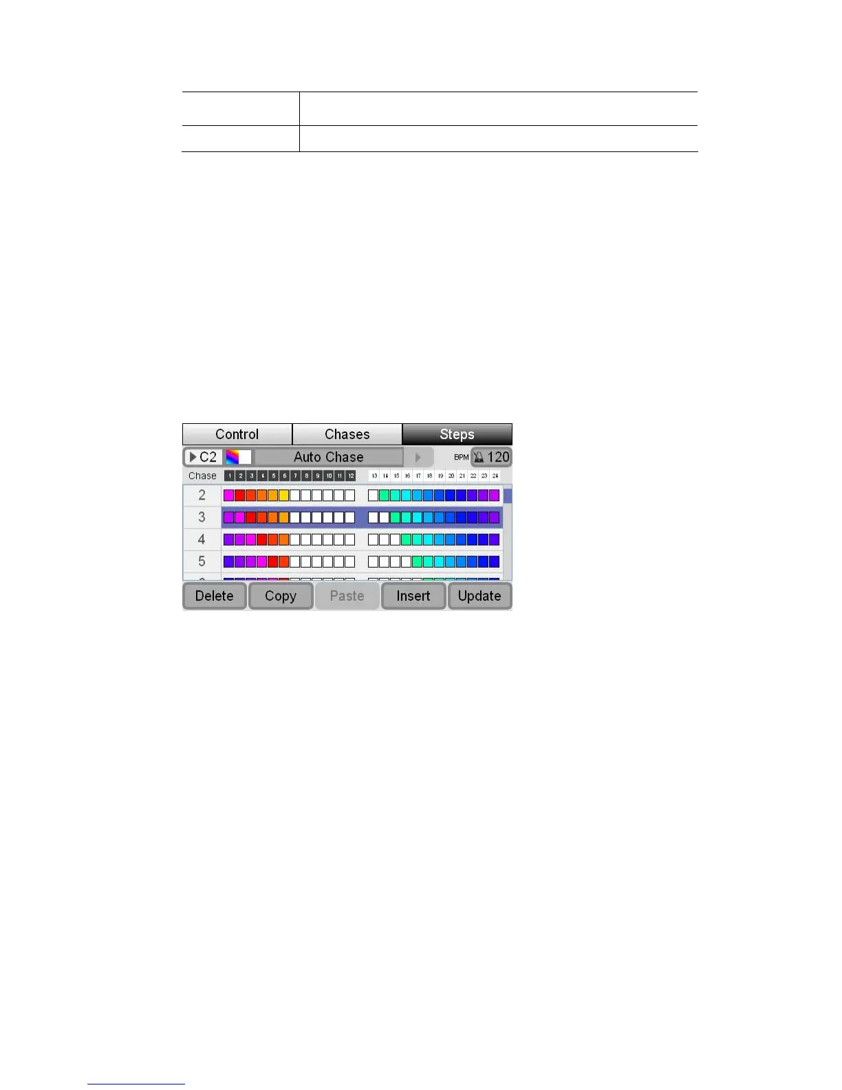 The icons show the colour and intensity of each of the 12 fixtures for each step