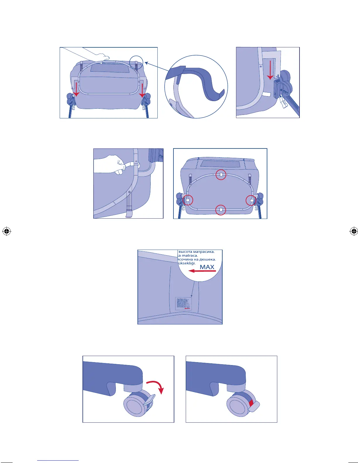 Lock all four wheels of the co-sleeping cot, lowering the levers to lock them so that the red mark is fully visible