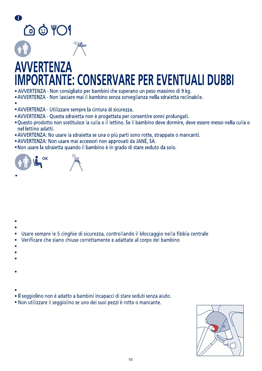 "Non utilizzare il seggiolone a meno che tutti i componenti non siano correttamente agganciati e regolati ".