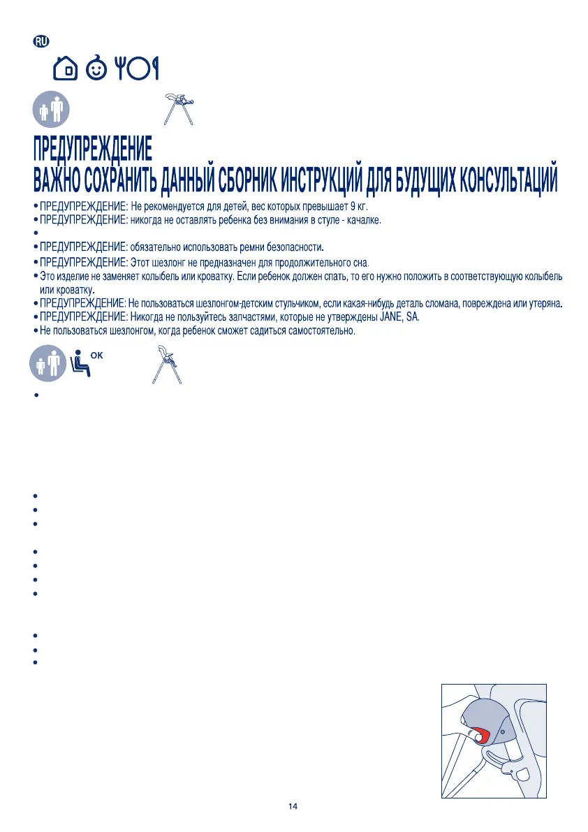 Не используйте стульчик для кормления, если какая-нибудь его часть повреждена или отсутствует.
