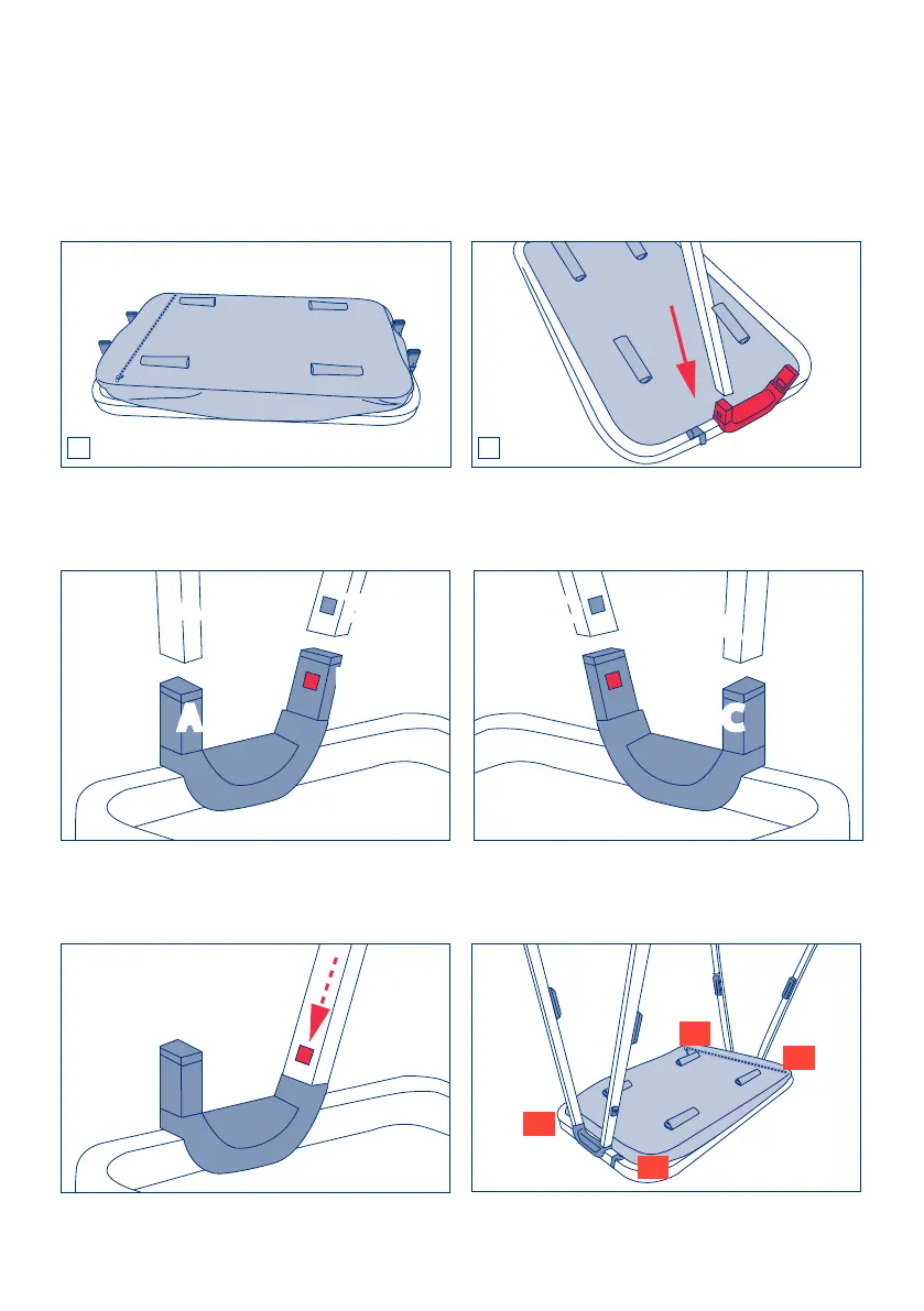 Introduisez les 4 pieds dans les supports en plastique en emboîtant l’orice latéral du pied dans l’onglet du sup-
