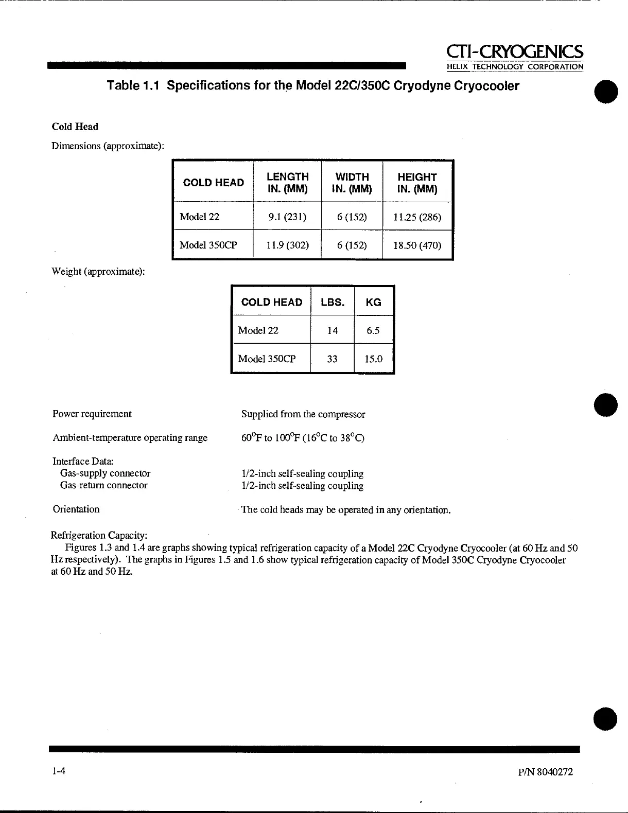 Table 1.1 Specifications for the Model 22C/350C Cryodyne Cryocooler