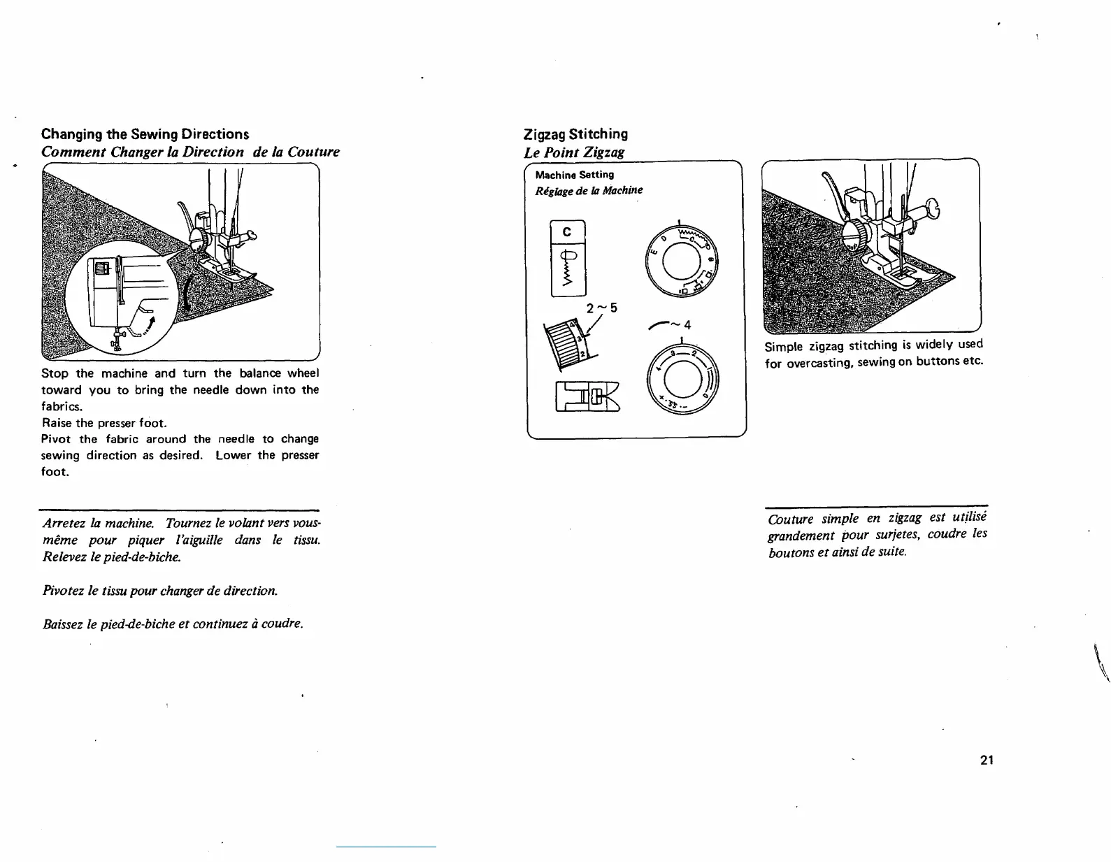 Janome 107 - Comment Changer la Direction de la Couture; Changing the Sewing Directions; Zigzag Stitching; Le Point Zigzag