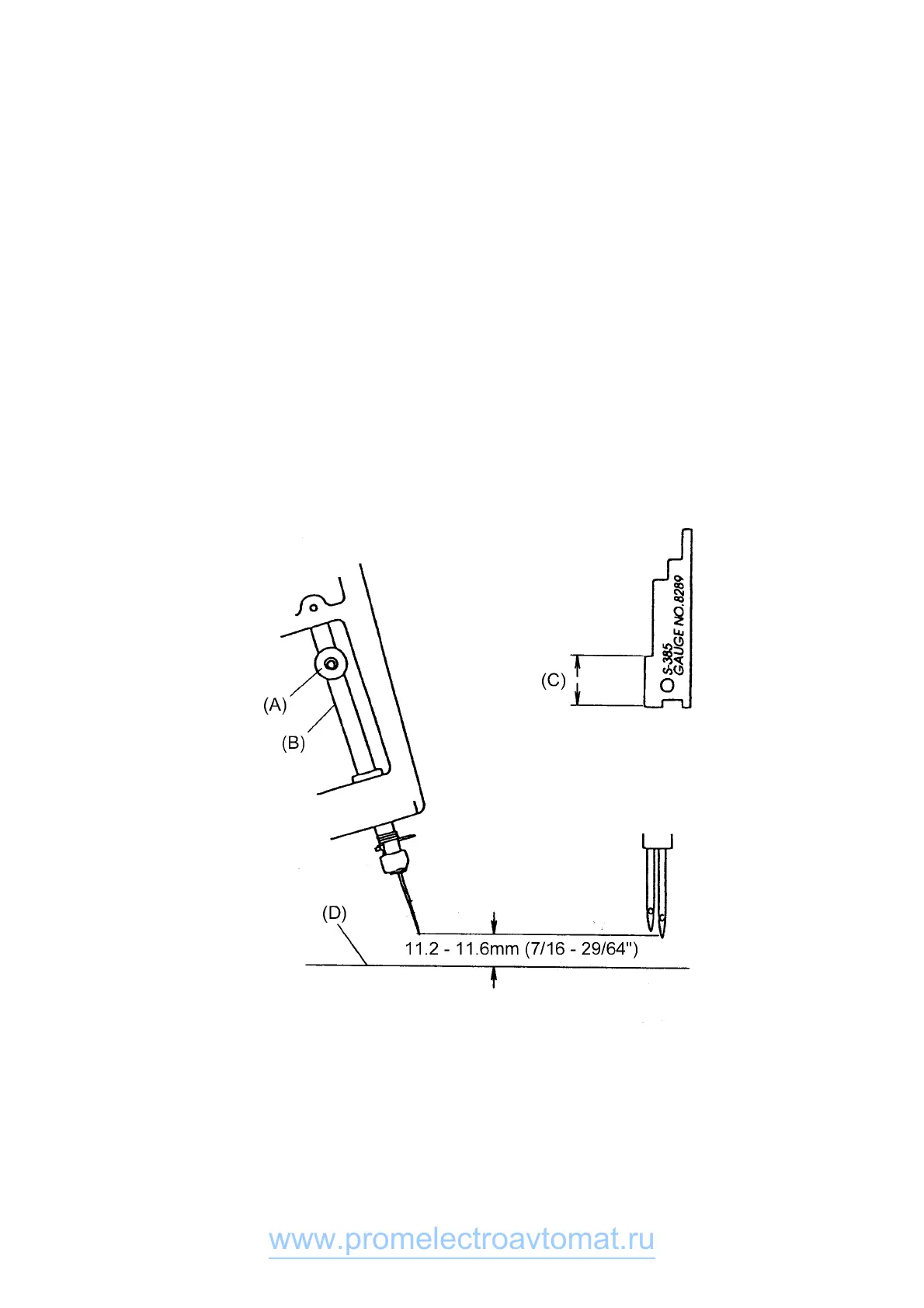 The distance between the tip of needle on the right and the surface of needle plate (D) should