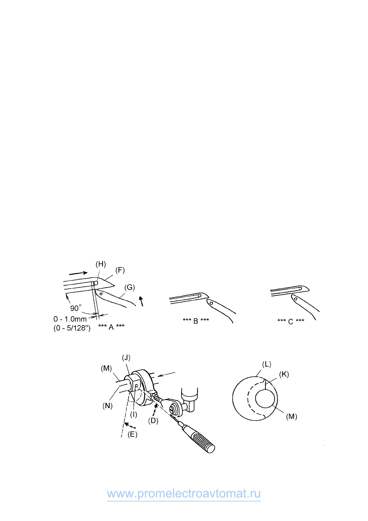 distance should be 1.6 to 1.8 mm (1/16 to 9/128”) when the upper looper (C) is at the