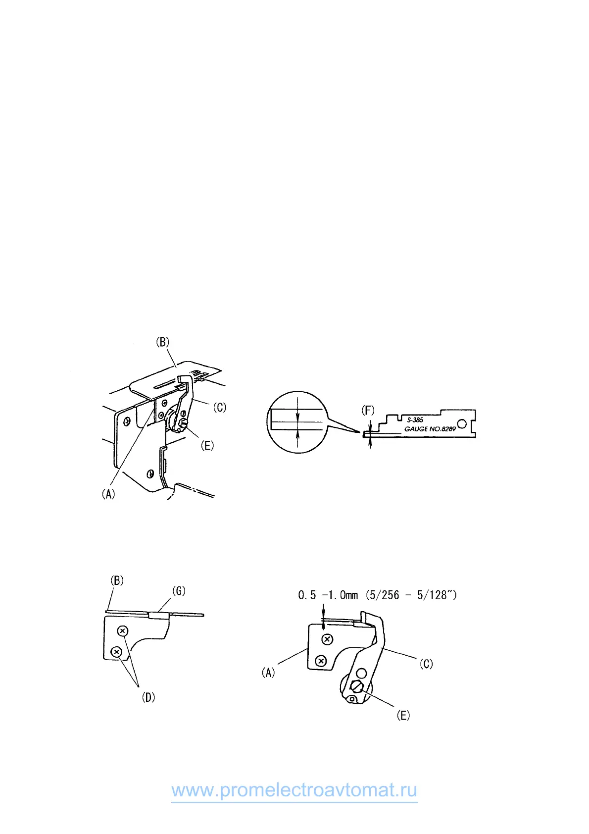 When the upper looper (A) meets with needle (B), the clearance (D) should be: