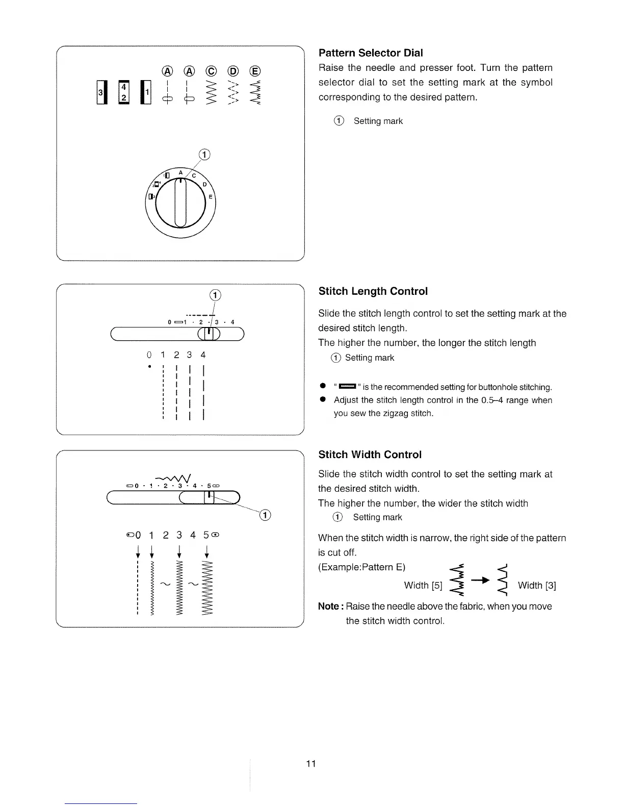 Janome 405 - Stitch Selection Controls; Using the Pattern Selector Dial; Adjusting Stitch Length; Adjusting Stitch Width