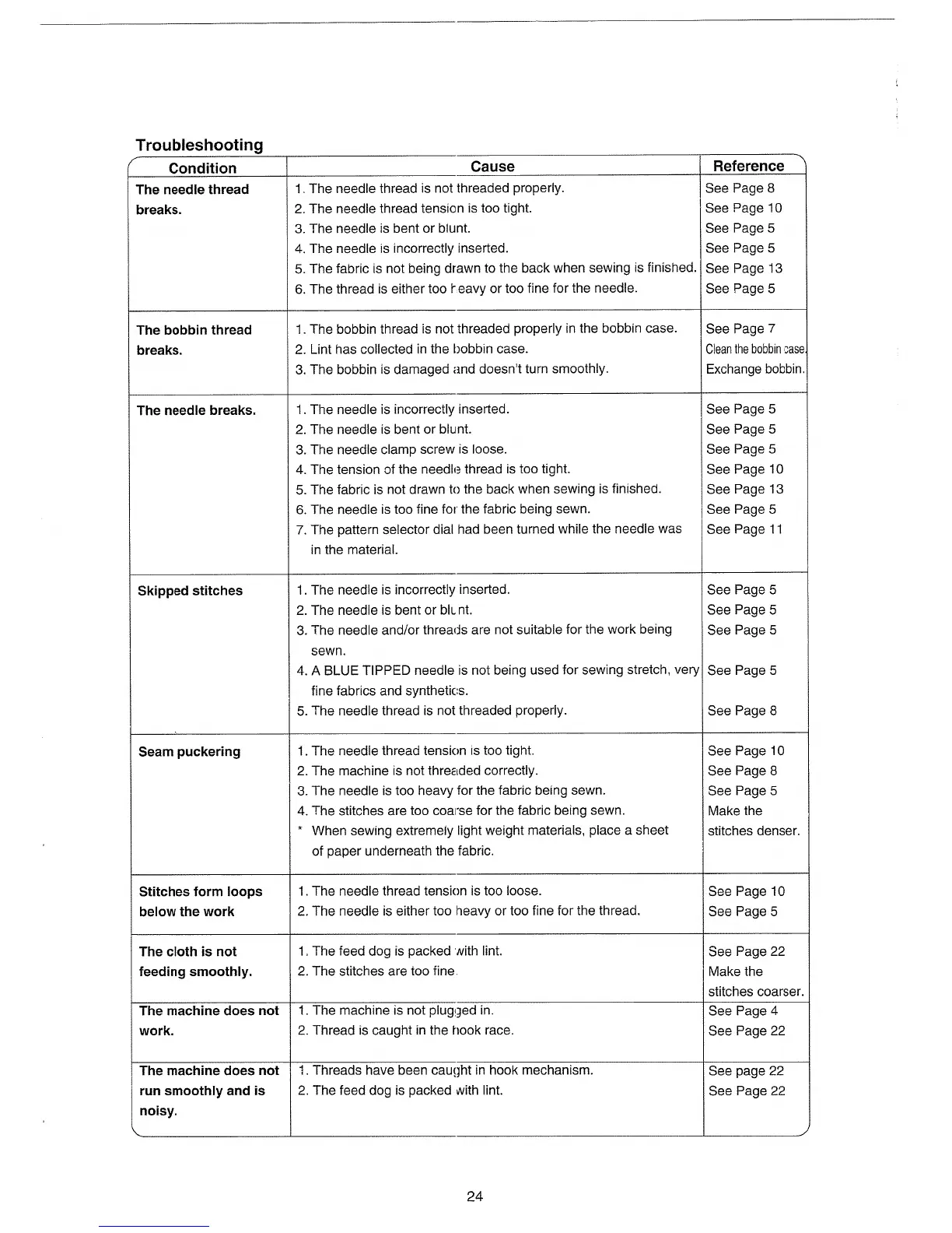 Janome 405 - Troubleshooting Common Issues; Needle Thread Breakage Causes; Bobbin Thread Breakage Causes; Needle Breakage and Skipped Stitches