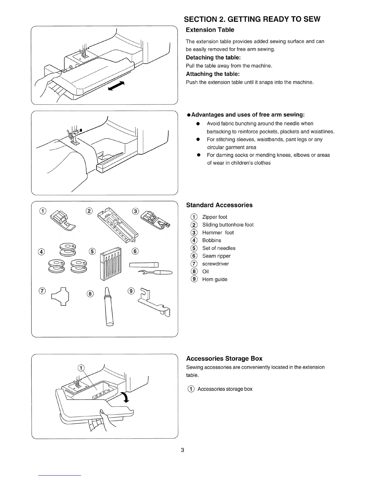 Janome 405 - Getting Ready to Sew; Extension Table; Free Arm Sewing; Standard Accessories