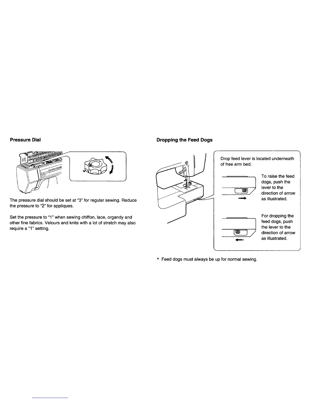 Janome 4623LE PLUS - Pressure Dial; Dropping the Feed Dogs