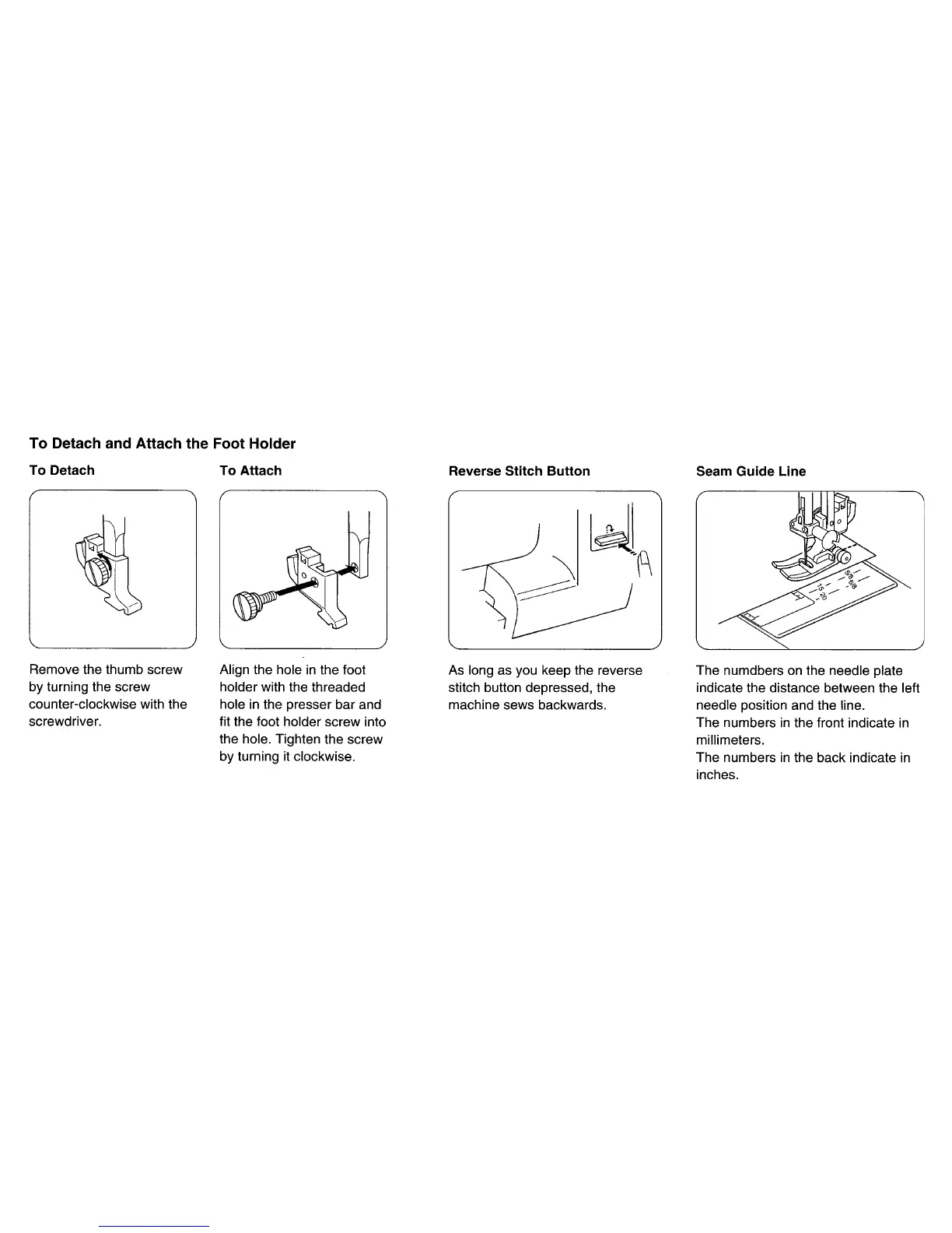 Janome 4623LE PLUS - To Detach and Attach the Foot Holder; Reverse Stitch Button; Seam Guide Line