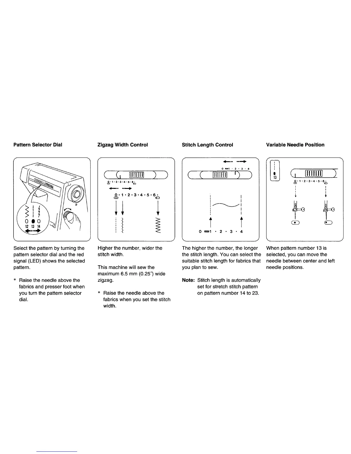 Janome 4623LE PLUS - Pattern Selector Dial; Zigzag Width Control; Stitch Length Control; Variable Needle Position