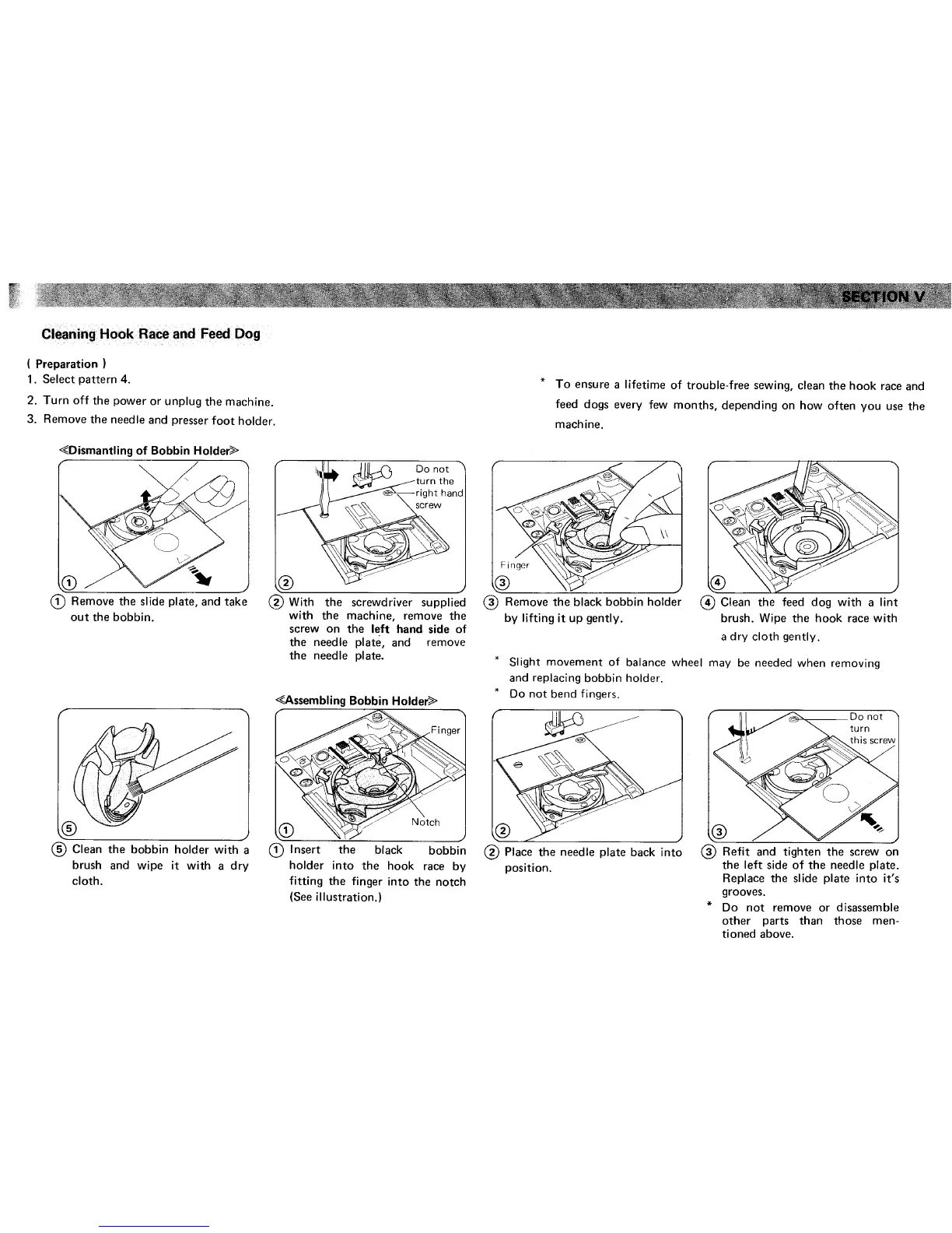 Janome 5001 Memory - Cleaning Hook Race and Feed Dog; Dismantling of Bobbin Holder; Assembling Bobbin Holder