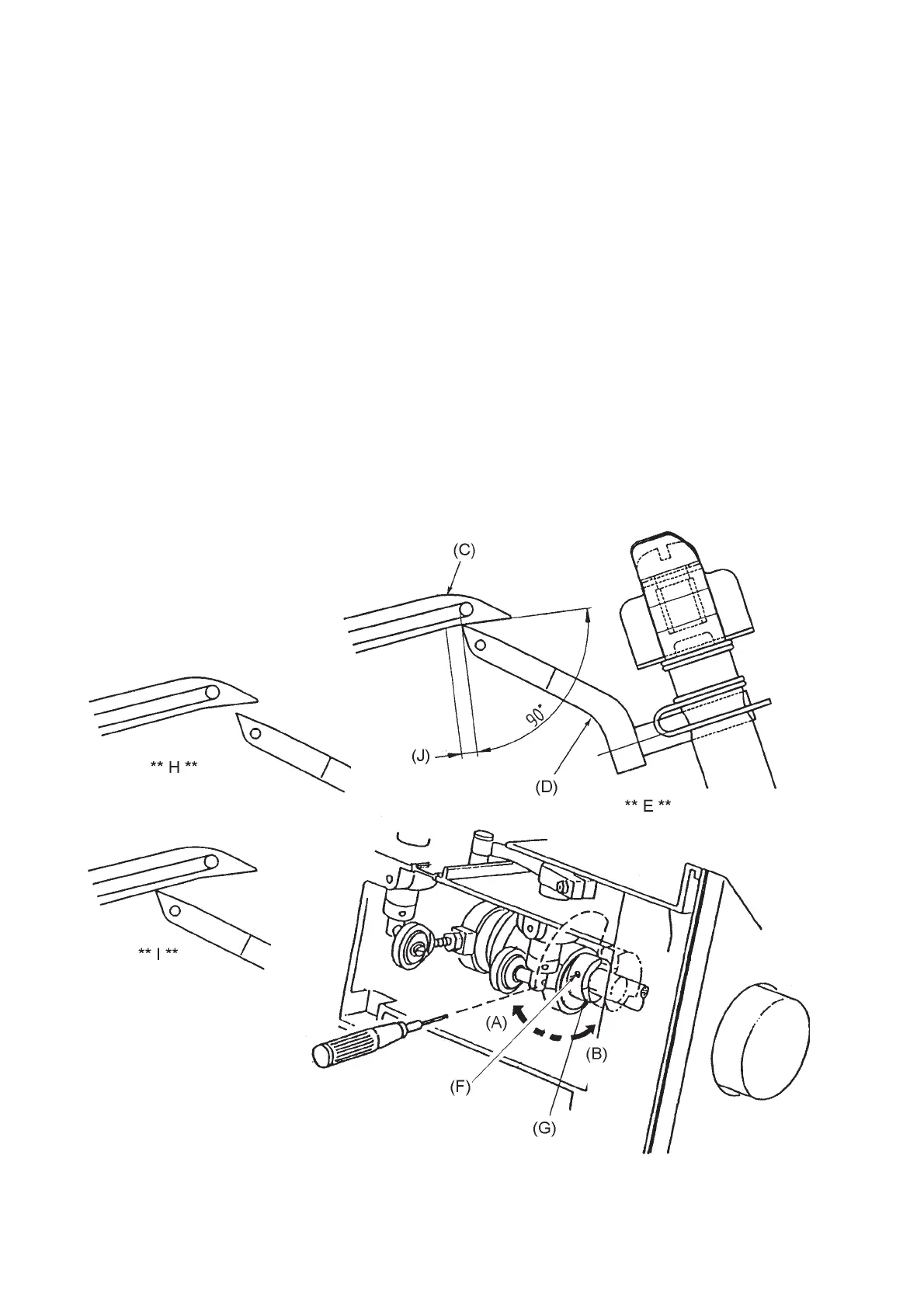 3. Loosen the two setscrews (F), and adjust the timing by turning the upper looper drive cam (G)