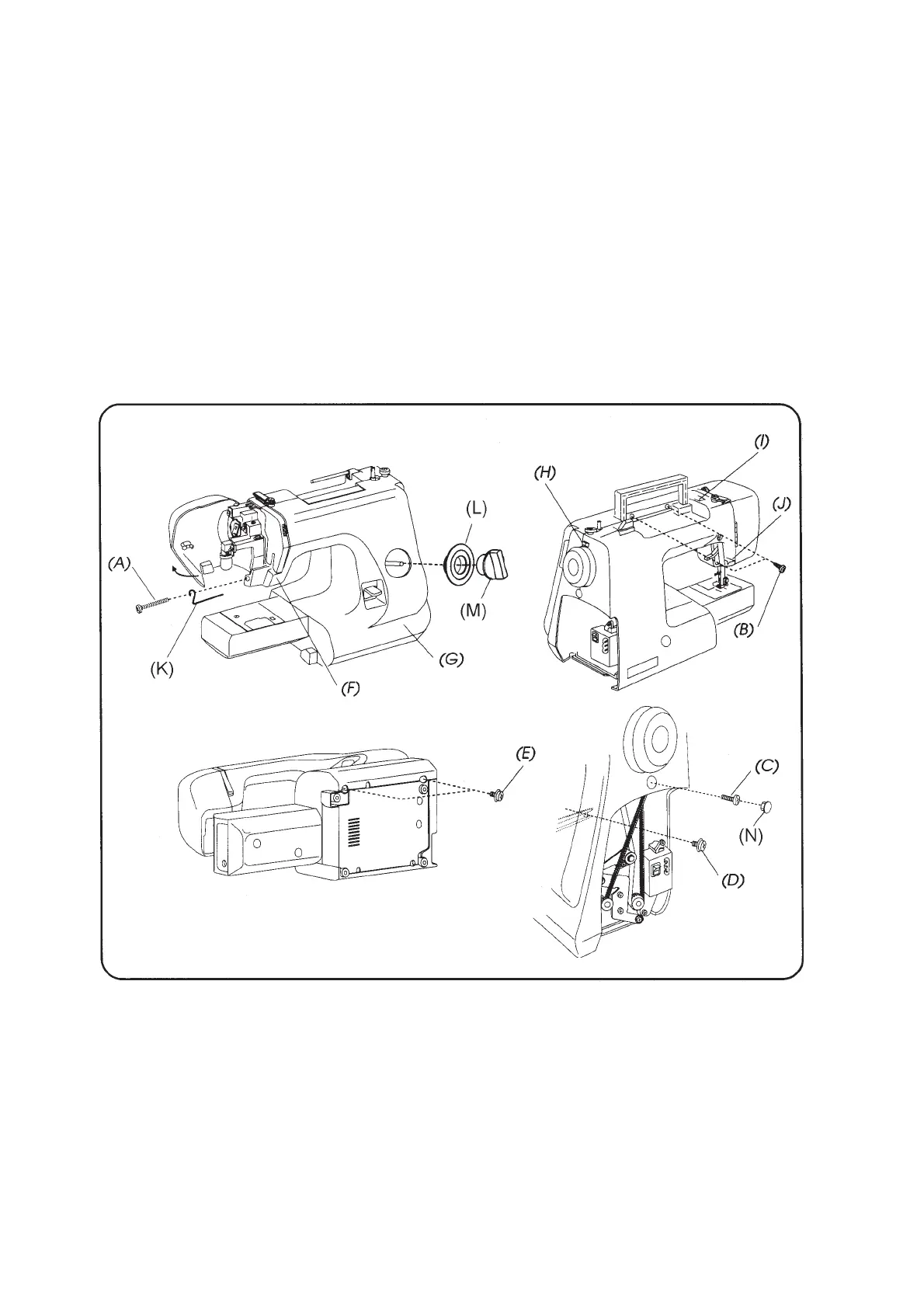 3. Remove the cap (N) , then set screws (A), (B). (C) and Arm thread guide (K). Loosen the