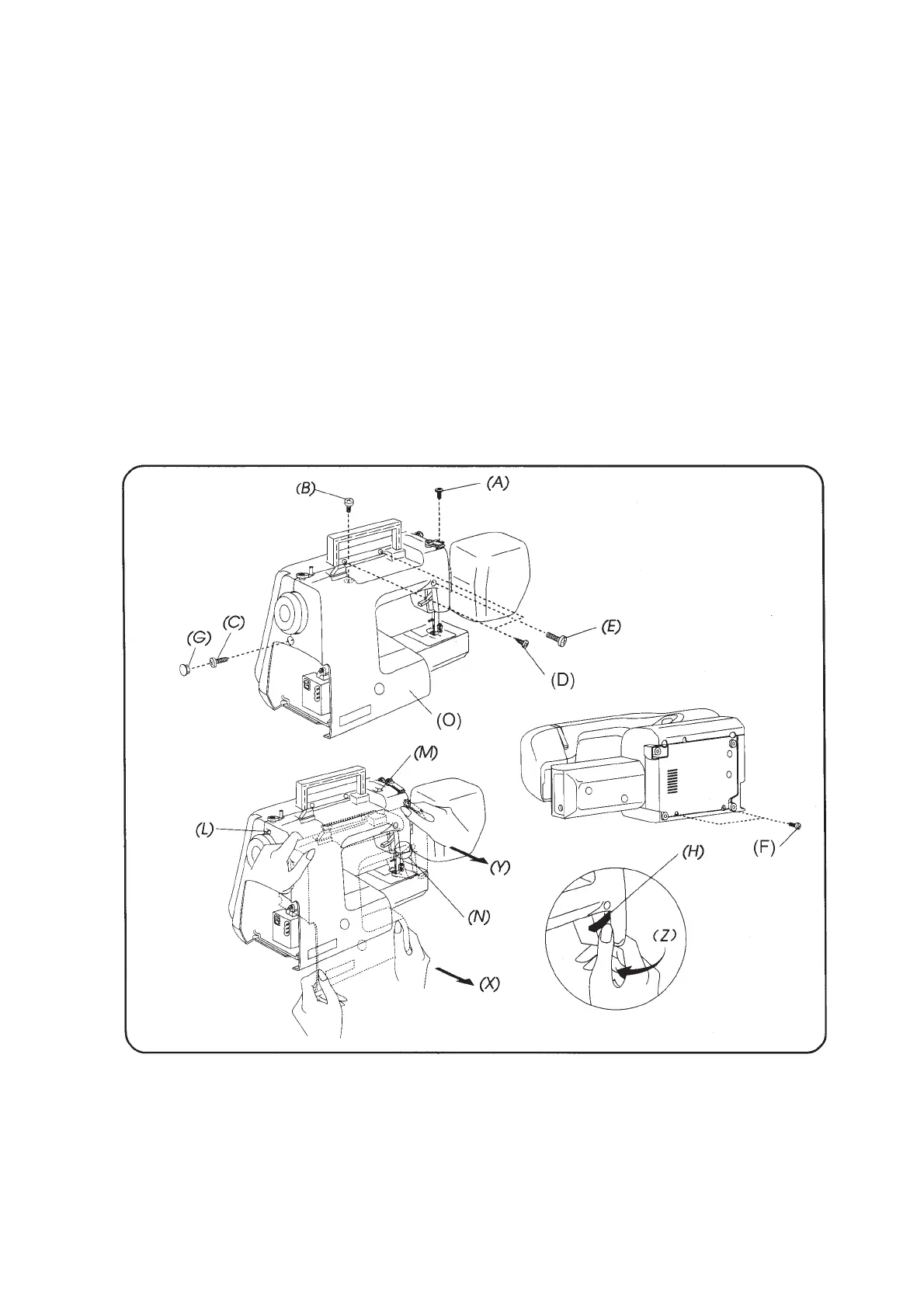 While sliding the rear cover to the left, clear the presser bar lifter (h) through the slit (See