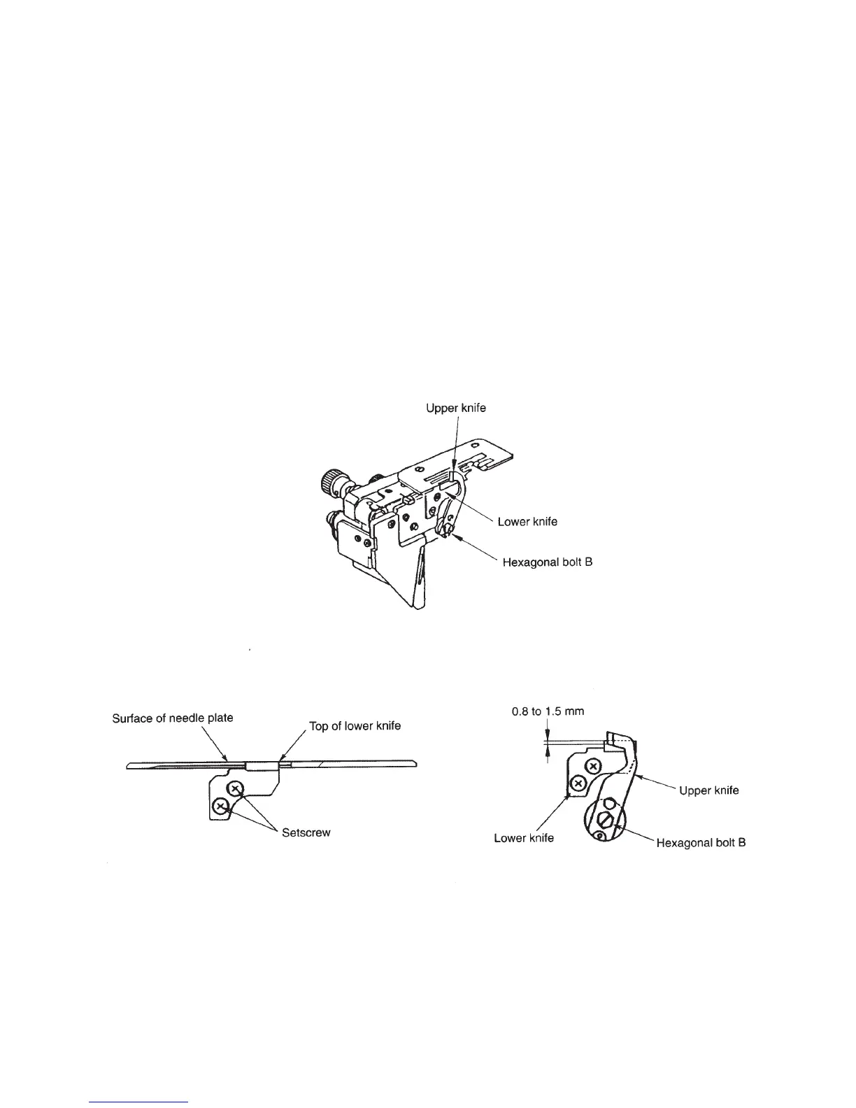 The tip of the lower knife should be leveled with the surface of needle plate. When the upper knife