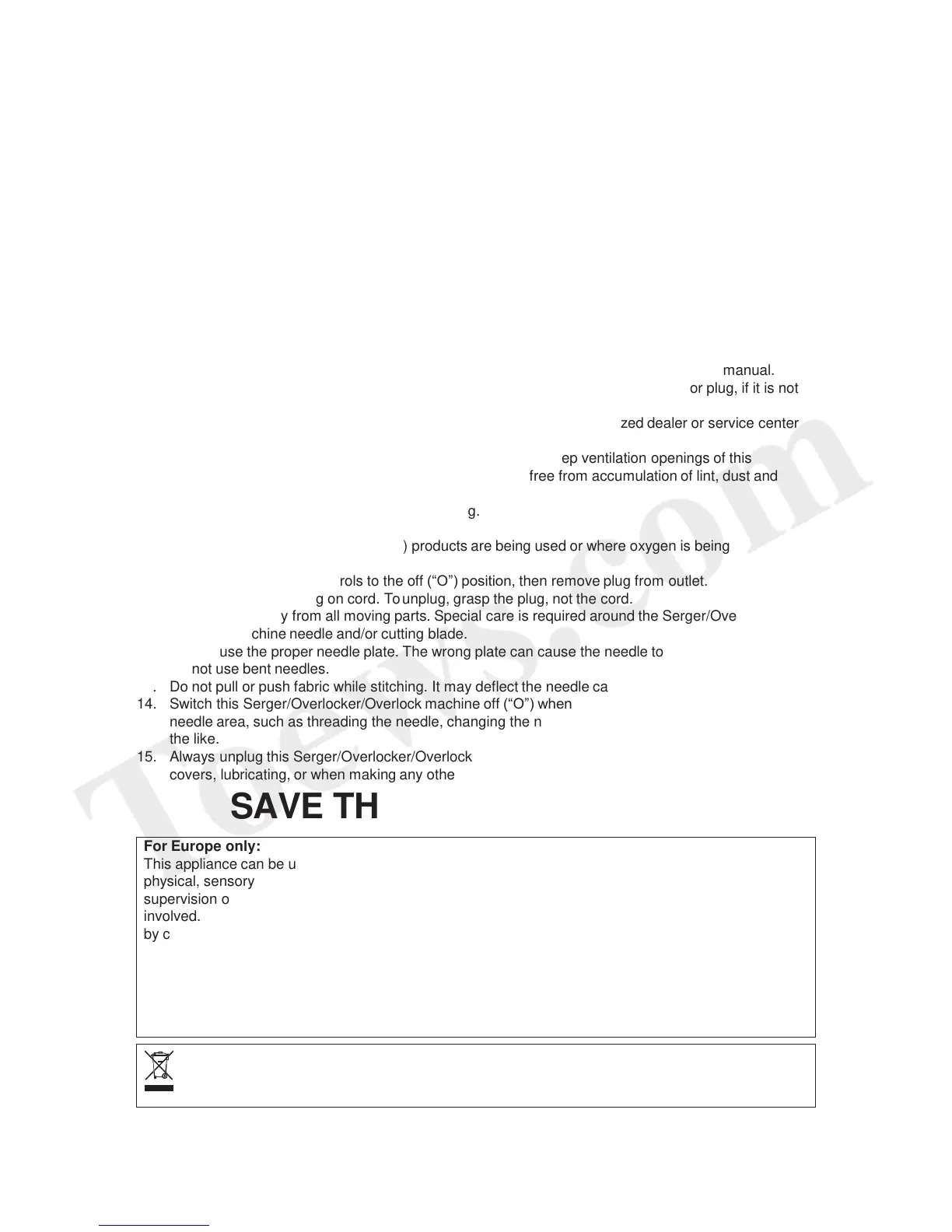15. Always unplug this Serger/Overlocker/Overlock machine from the electrical outlet when removing