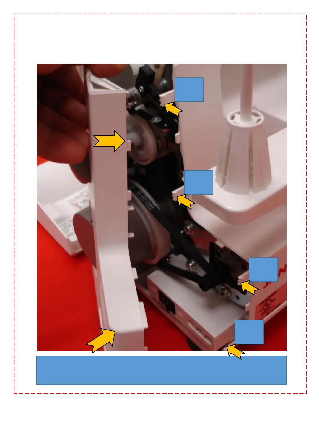 Reattach the belt cover. Be careful not to break the locking