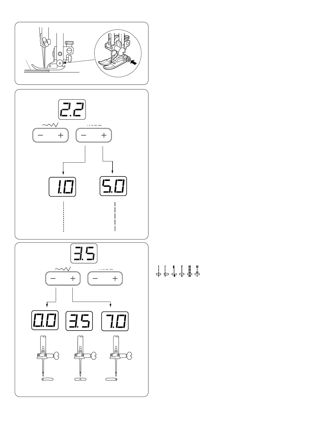 Press “–” or “+” to adjust the stitch length.