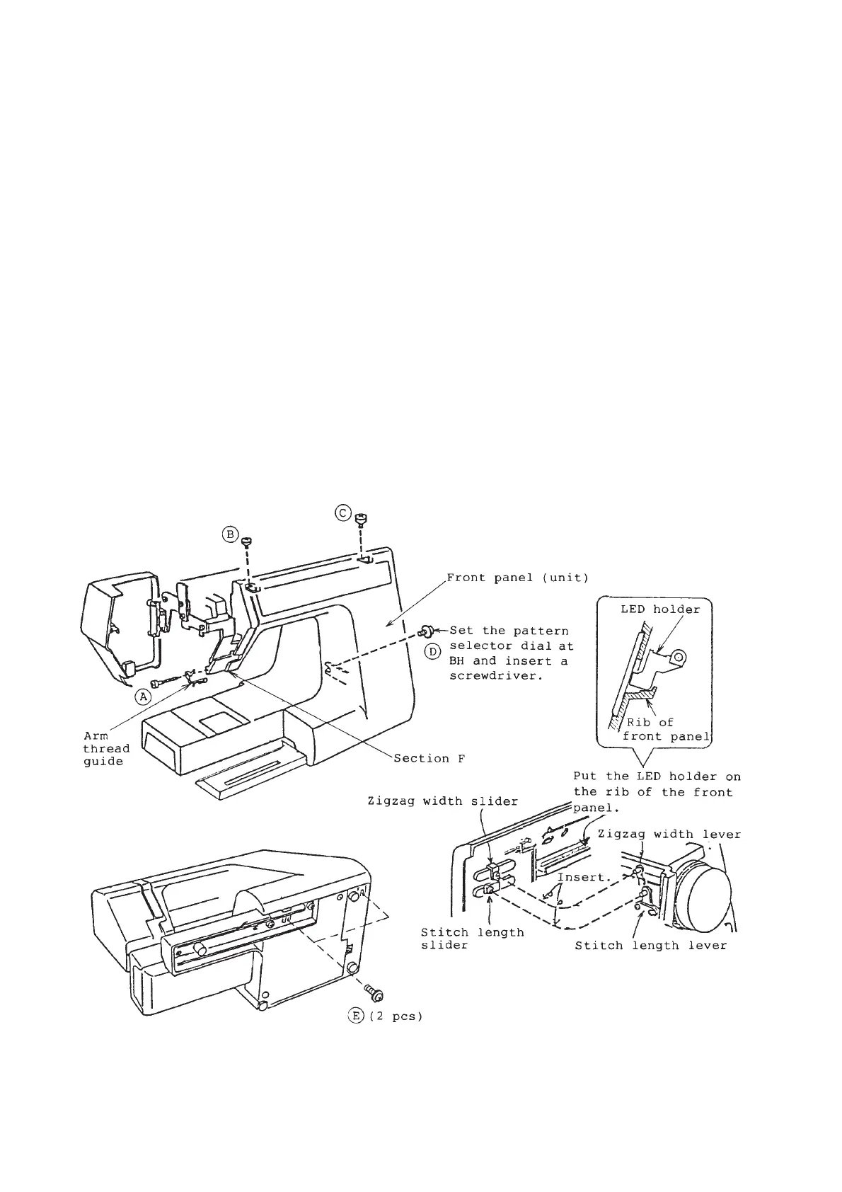 (7) Tighten the set screws (A) to (E) to fasten the front panel. (Fasten the arm thread guide