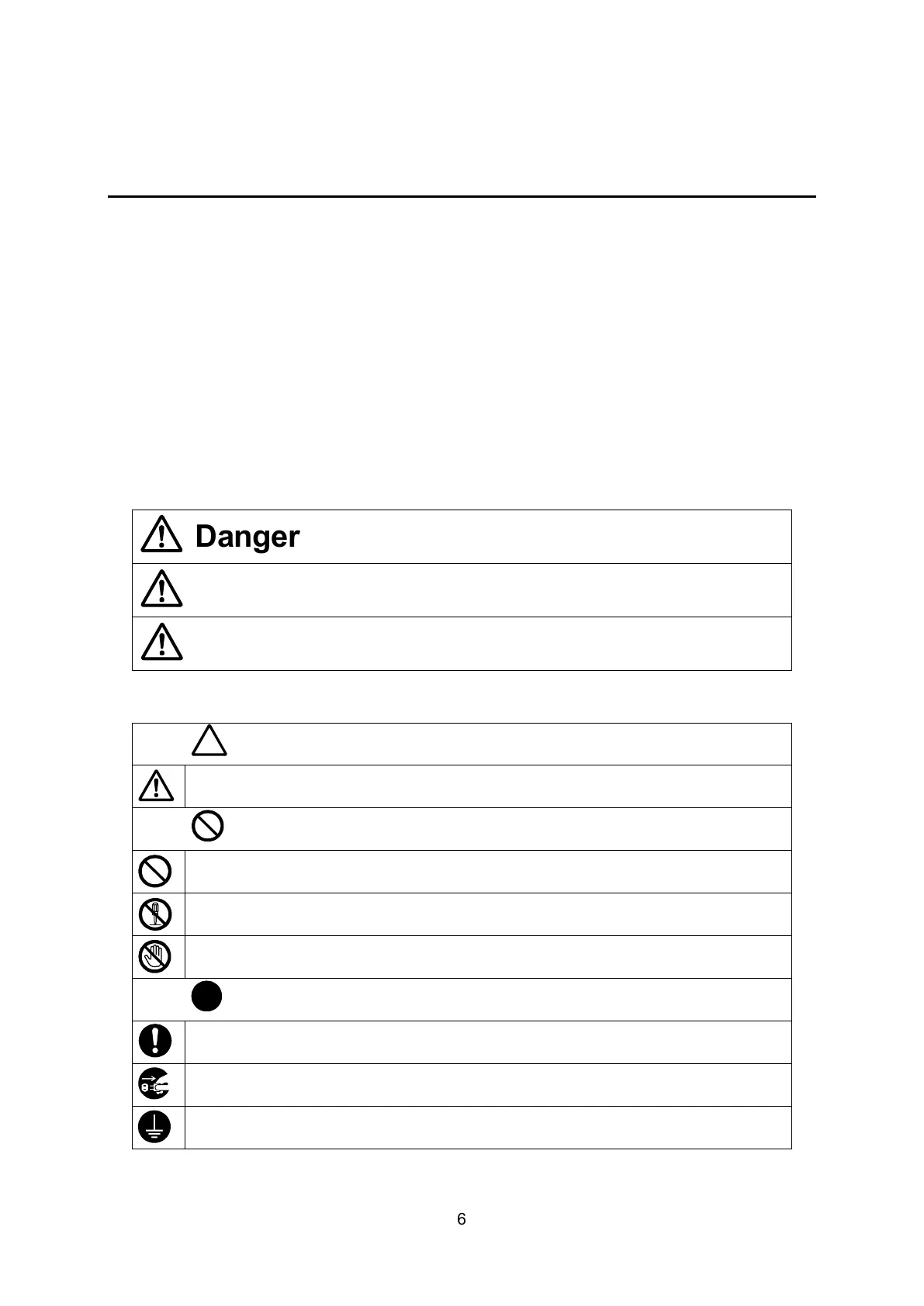 The following symbols list the nature of the danger and any necessary safety methods to be taken.