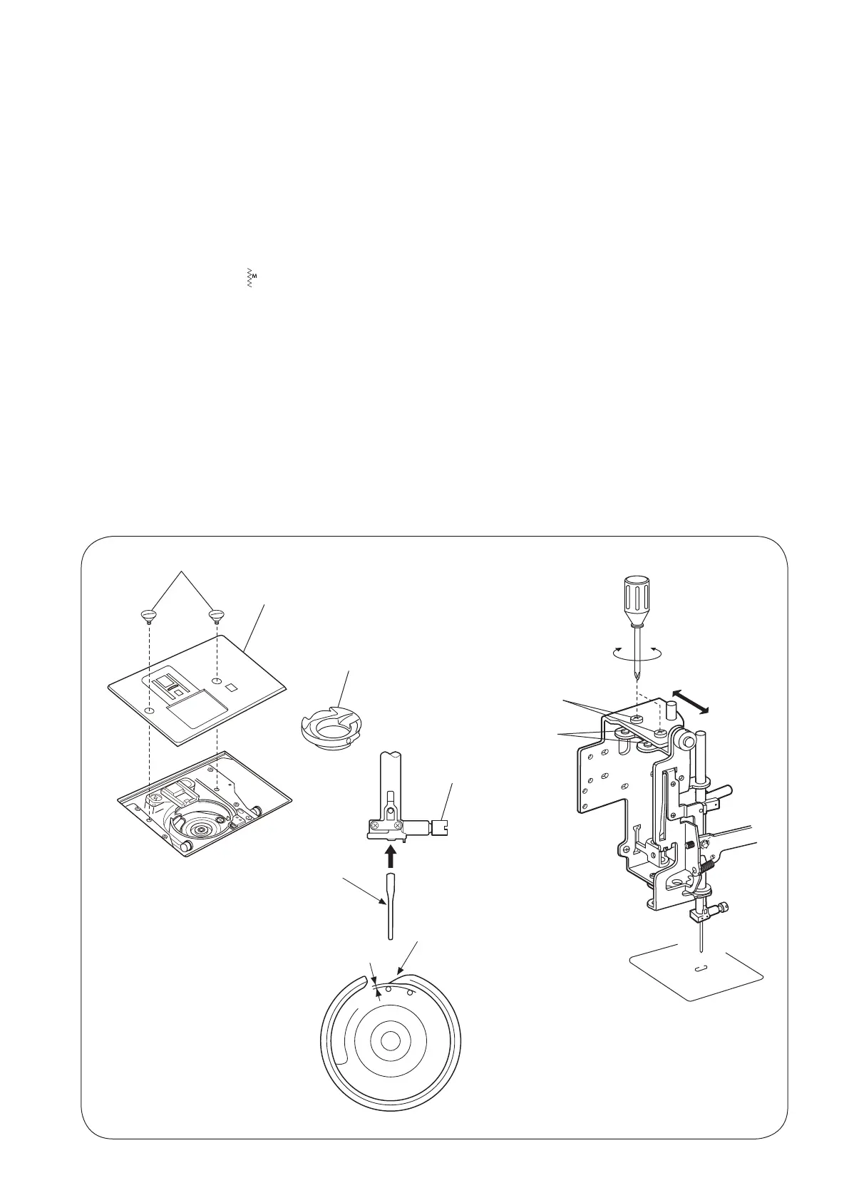 Adjusttheclearancebetweeentheneedleandhookbetweeen-0.10to+0.05mm.Tightenthesetscrews.