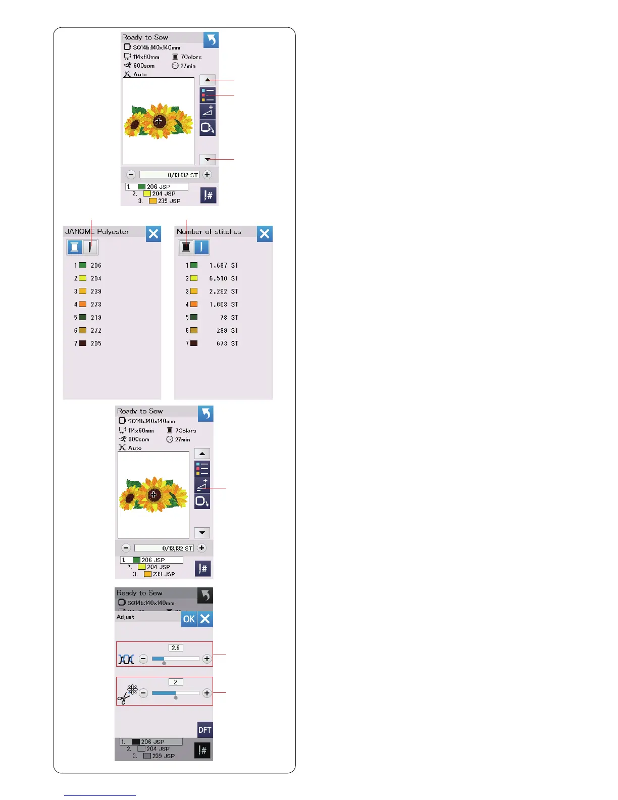 Press the color list key e to view a list of thread colors