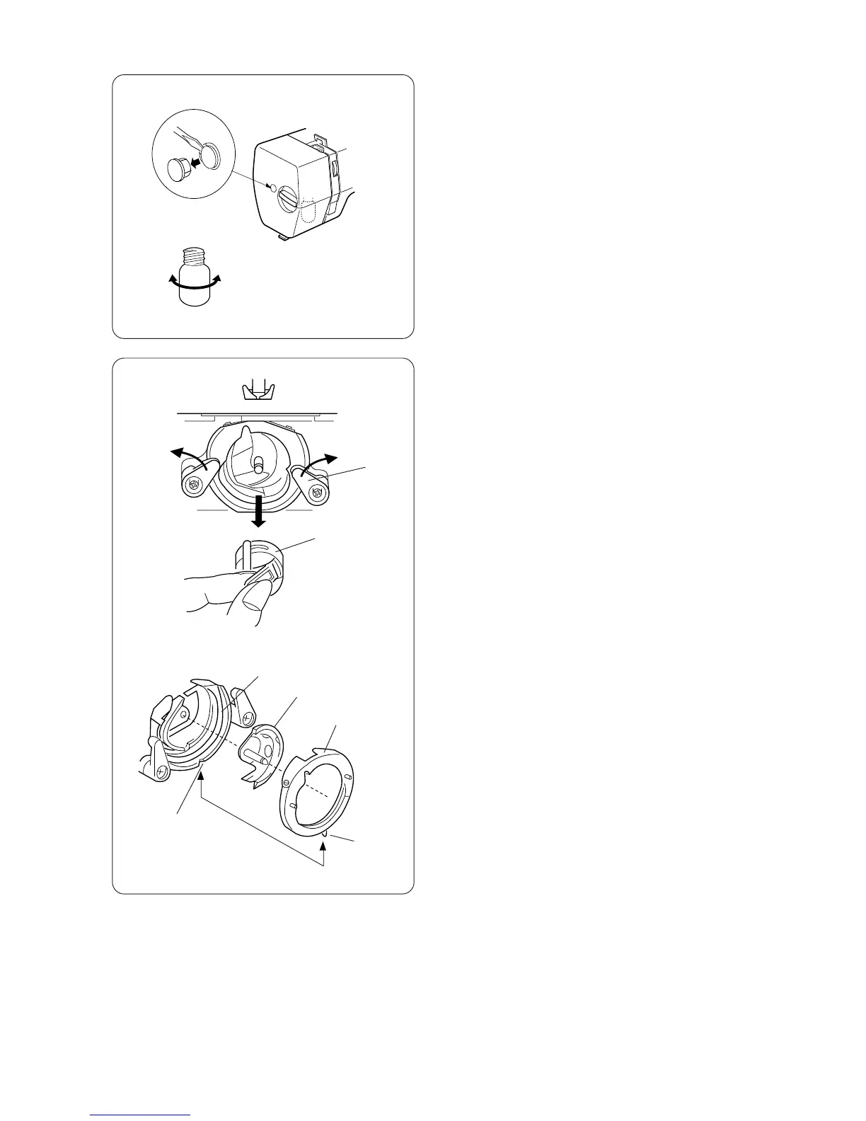 Open the hinged latch of bobbin case and take it out of