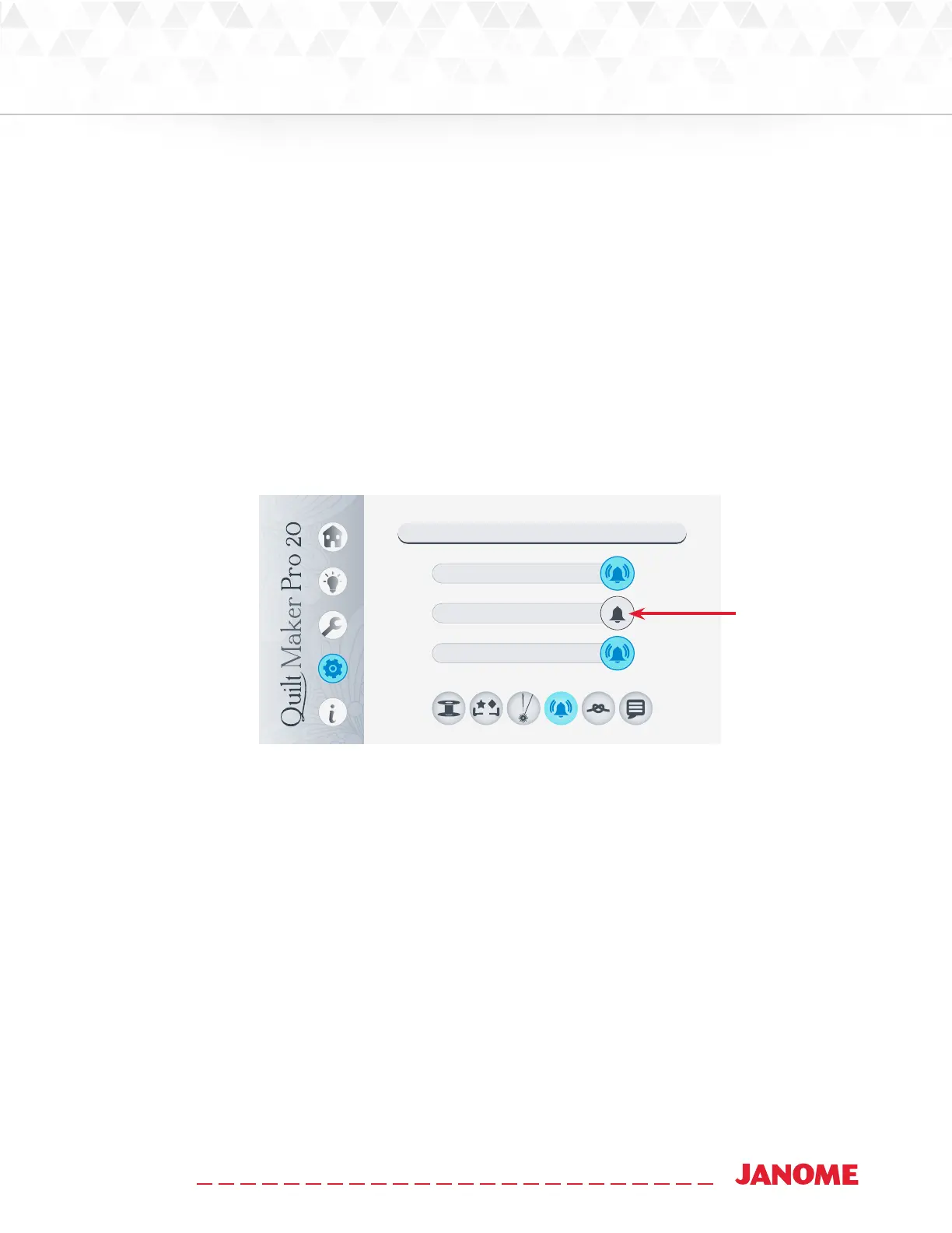 The alarm sengs enable you to quickly turn on or o the alarms for the low bobbin, thread breaks, and