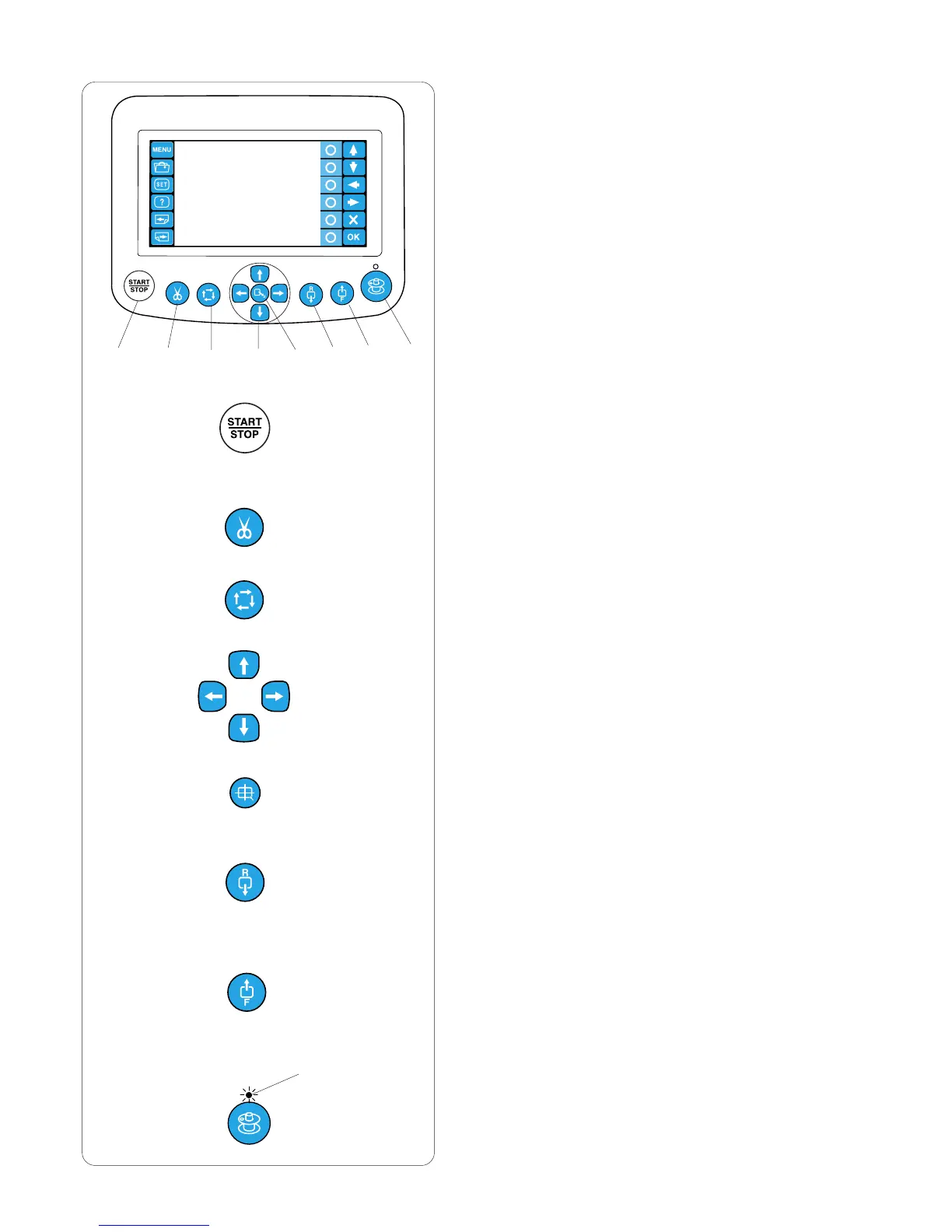 The button glows red when the machine is stitching,