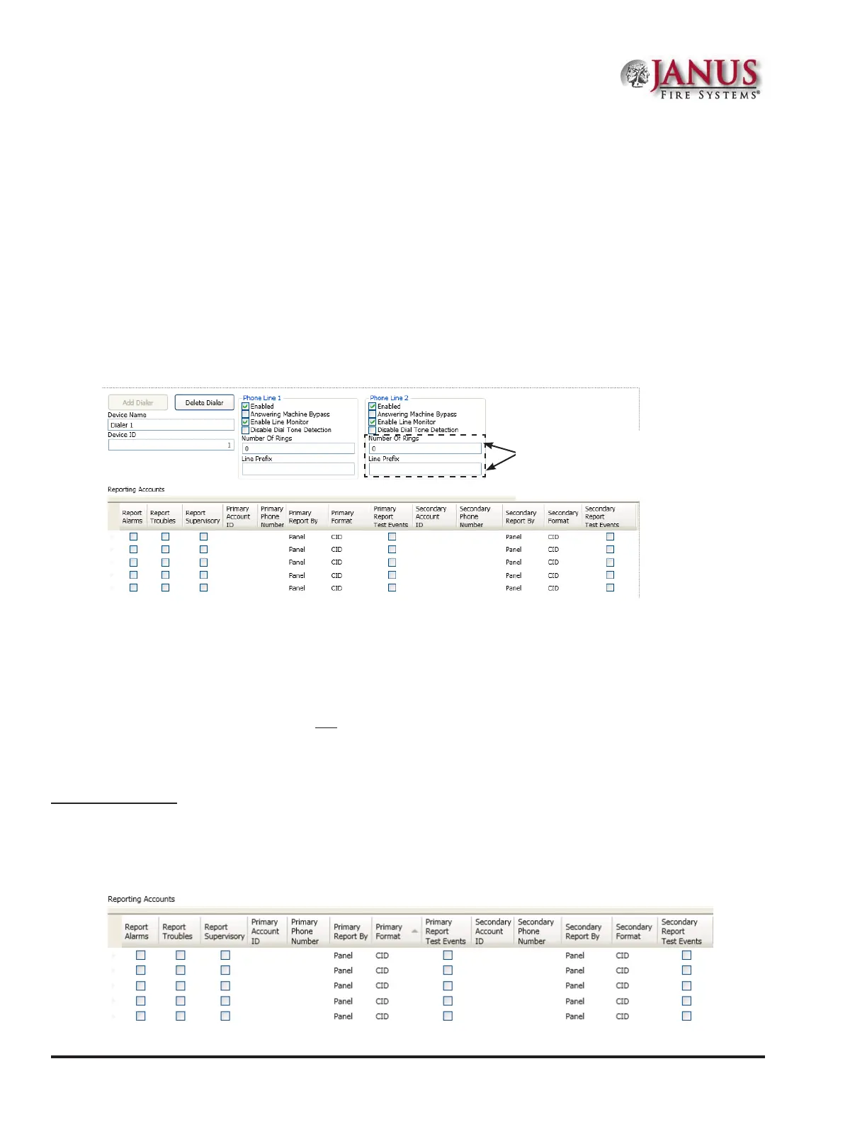 e “Reporting Accounts” section is used to program DACT operations and to customize the format of the reporting