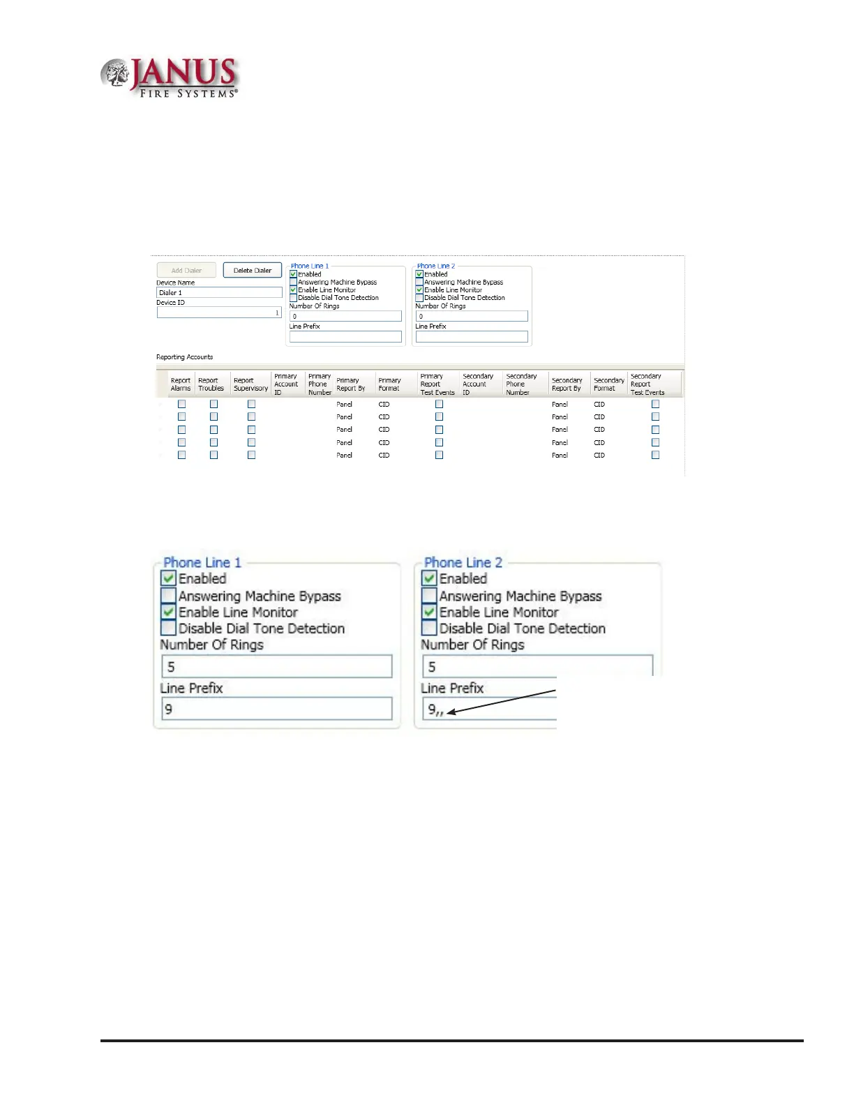 e two ",," (commas) instruct the dialer to pause 2 seconds before dialing the reporting account numbers.